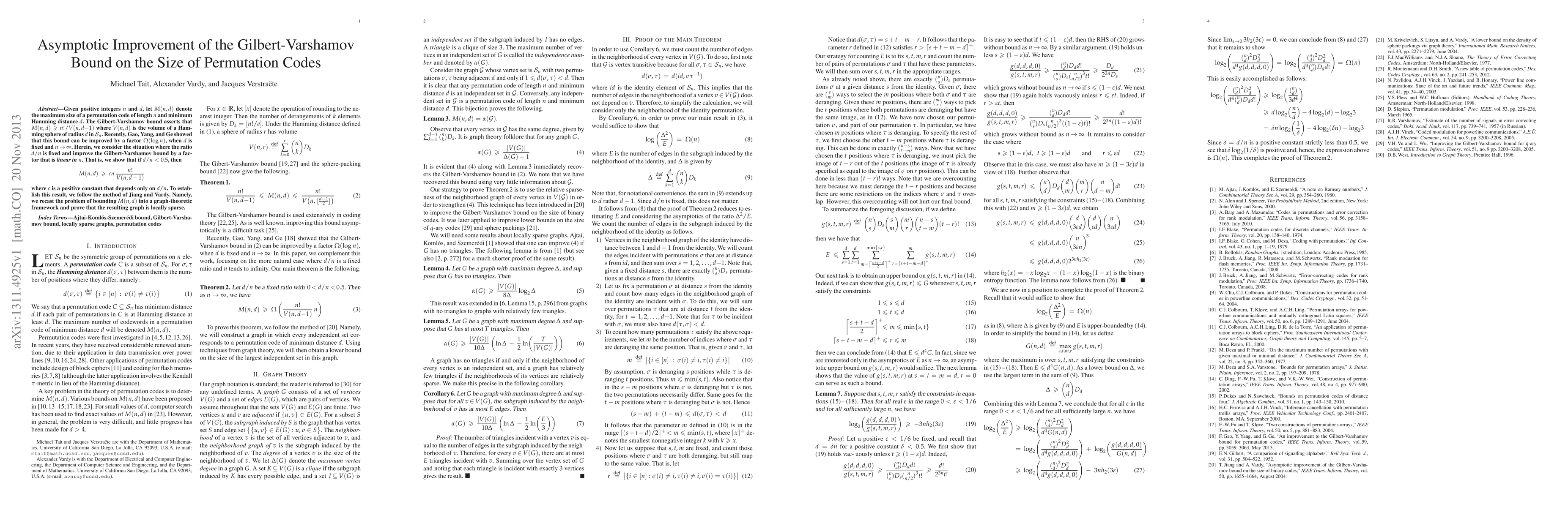 This research improves the Gilbert-Varshamov bound on the size of permutation codes by a linear factor in n when d/n < 0.5, offering better bounds for specific cases.