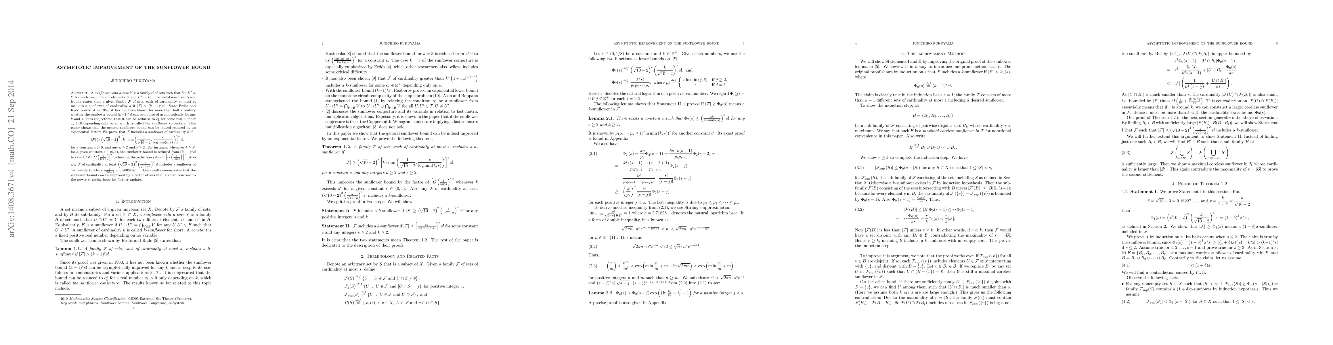 Researchers prove that the sunflower bound can be improved asymptotically from $(k-1)^s s!$ to a factor of less than $c_k^s$ for some real number $c_k$, improving the conjecture's potential for update.