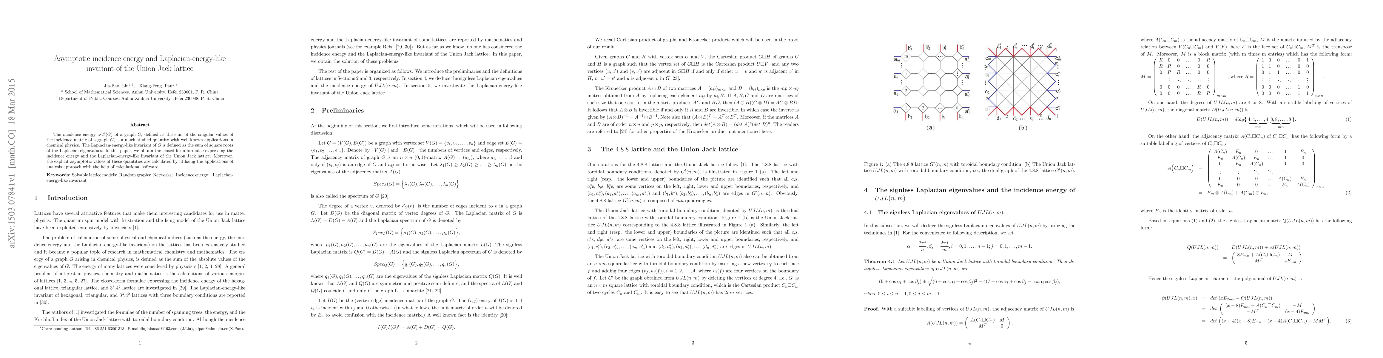 The incidence energy $\mathscr{IE}(G)$ of a graph $G$, defined as the sum of the singular values of the incidence matrix of a graph $G$, is a much studied quantity with well known applications in chemical physics. The Laplacian-energy-like invariant of $G$ is defined as the sum of square roots of the Laplacian eigenvalues. In this paper, we obtain the closed-form formulae expressing the incidence energy and the Laplacian-energy-like invariant of the Union Jack lattice. Moreover, the explicit asymptotic values of these quantities are calculated by utilizing the applications of analysis approach with the help of calculational software.