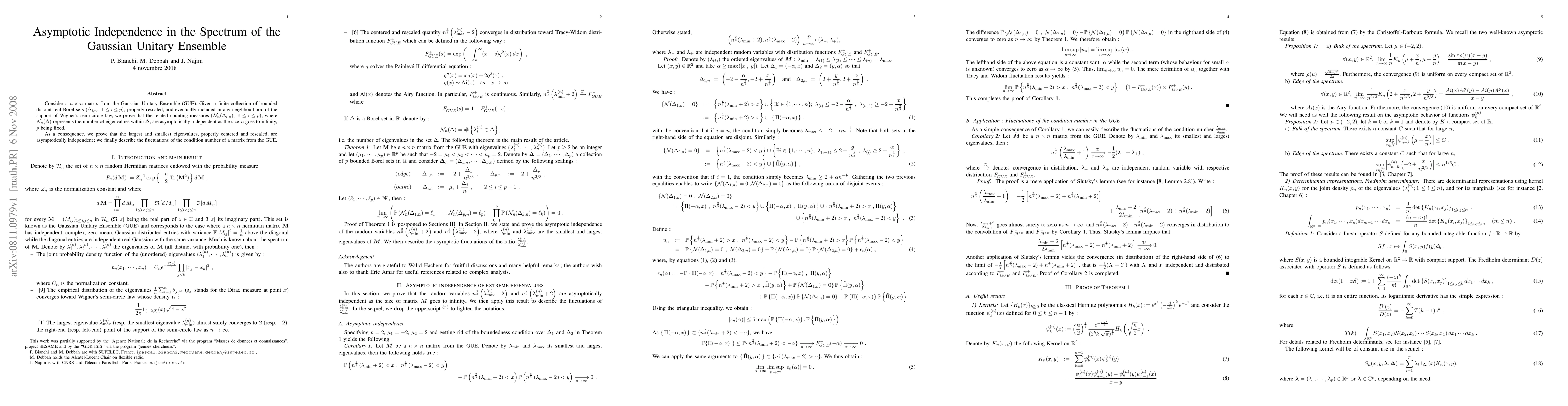 Researchers prove that eigenvalues of a large Gaussian Unitary Ensemble matrix are asymptotically independent when considering bounded disjoint sets, leading to insights into the largest and smallest eigenvalues and condition number fluctuations.
