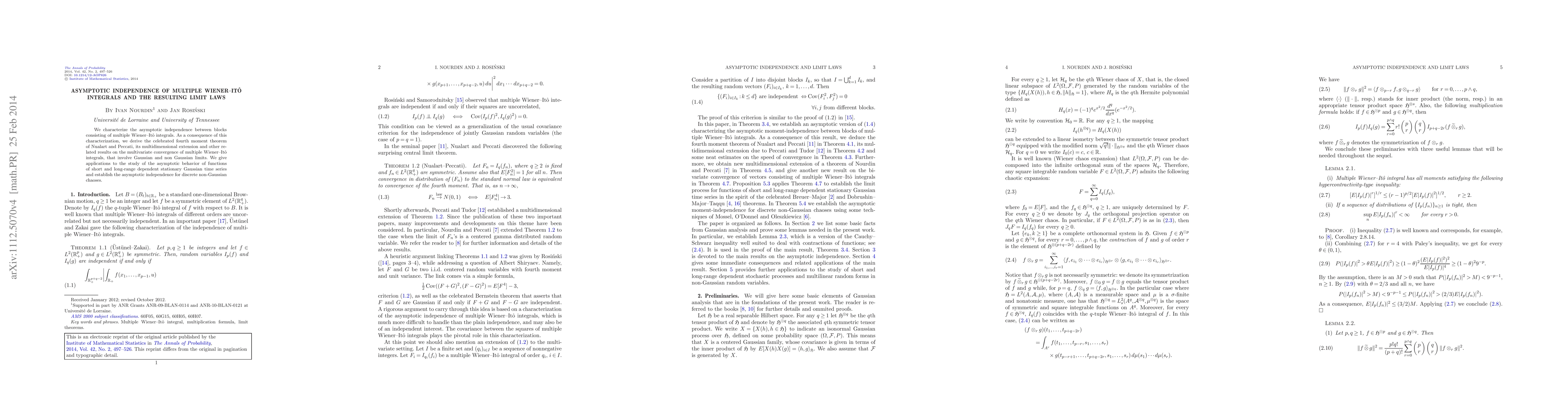 We characterize the asymptotic independence between blocks consisting of multiple Wiener-It\^{o} integrals. As a consequence of this characterization, we derive the celebrated fourth moment theorem of Nualart and Peccati, its multidimensional extension and other related results on the multivariate convergence of multiple Wiener-It\^{o} integrals, that involve Gaussian and non Gaussian limits. We give applications to the study of the asymptotic behavior of functions of short and long-range dependent stationary Gaussian time series and establish the asymptotic independence for discrete non-Gaussian chaoses.