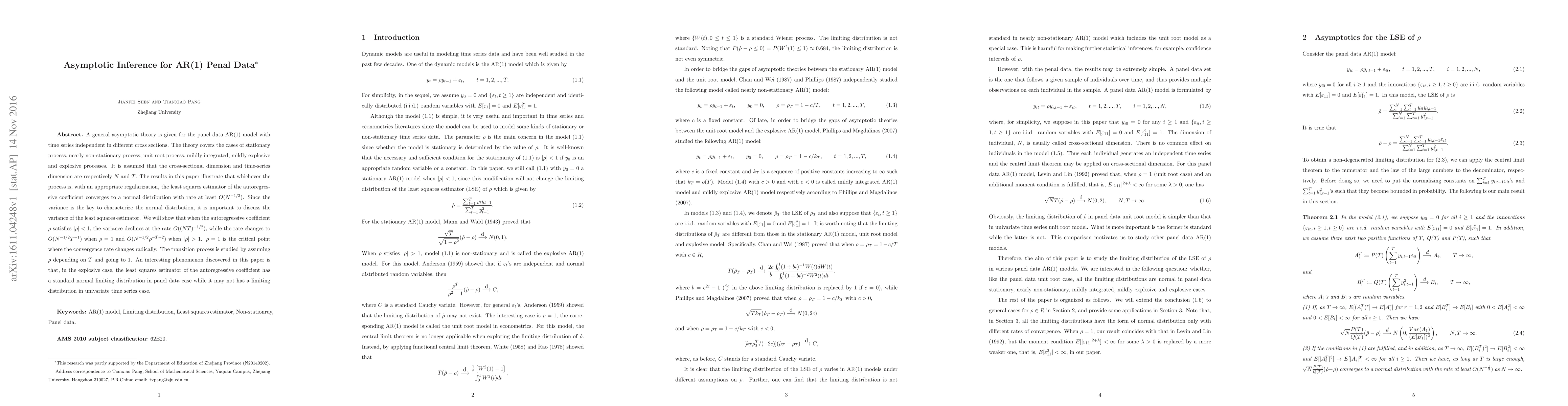 A general asymptotic theory is given for the panel data AR(1) model with time series independent in different cross sections. The theory covers the cases of stationary process, nearly non-stationary process, unit root process, mildly integrated, mildly explosive and explosive processes. It is assumed that the cross-sectional dimension and time-series dimension are respectively $N$ and $T$. The results in this paper illustrate that whichever the process is, with an appropriate regularization, the least squares estimator of the autoregressive coefficient converges to a normal distribution with rate at least $O(N^{-1/3})$. Since the variance is the key to characterize the normal distribution, it is important to discuss the variance of the least squares estimator. We will show that when the autoregressive coefficient $\rho$ satisfies $|\rho|<1$, the variance declines at the rate $O((NT)^{-1/2})$, while the rate changes to $O(N^{-1/2}T^{-1})$ when $\rho=1$ and $O(N^{-1/2}\rho^{-T+2})$ when $|\rho|>1$. $\rho=1$ is the critical point where the convergence rate changes radically. The transition process is studied by assuming $\rho$ depending on $T$ and going to $1$. An interesting phenomenon discovered in this paper is that, in the explosive case, the least squares estimator of the autoregressive coefficient has a standard normal limiting distribution in panel data case while it may not has a limiting distribution in univariate time series case.