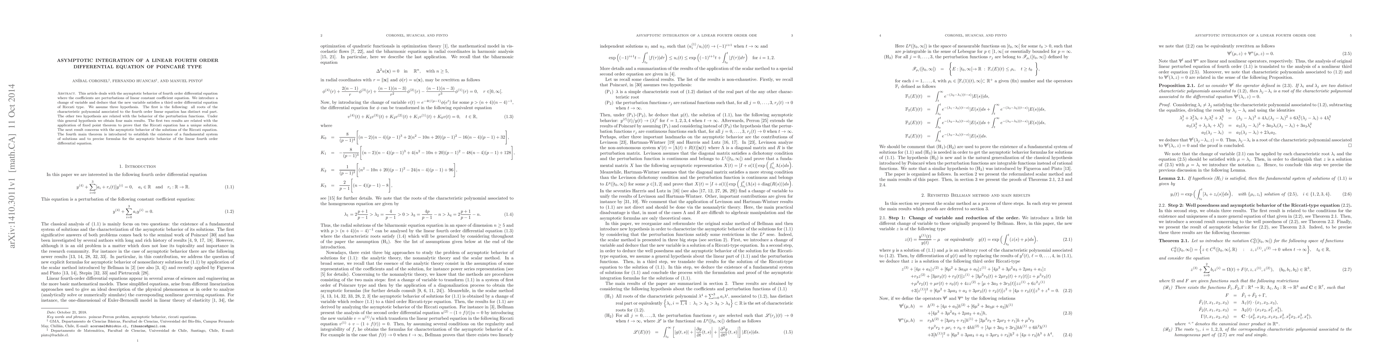 This article deals with the asymptotic behavior of fourth order differential equation where the coefficients are perturbations of linear constant coefficient equation. We introduce a change of variable and deduce that the new variable satisfies a third order differential equation of Riccati type. We assume three hypothesis. The first is the following: all roots of the characteristic polynomial associated to the fourth order linear equation has distinct real part. The other two hypothesis are related with the behavior of the perturbation functions. Under this general hypothesis we obtain four main results. The first two results are related with the application of fixed point theorem to prove that the Riccati equation has a unique solution. The next result concerns with the asymptotic behavior of the solutions of the Riccati equation. The fourth main theorem is introduced to establish the existence of a fundamental system of solutions and to precise formulas for the asymptotic behavior of the linear fourth order differential equation.