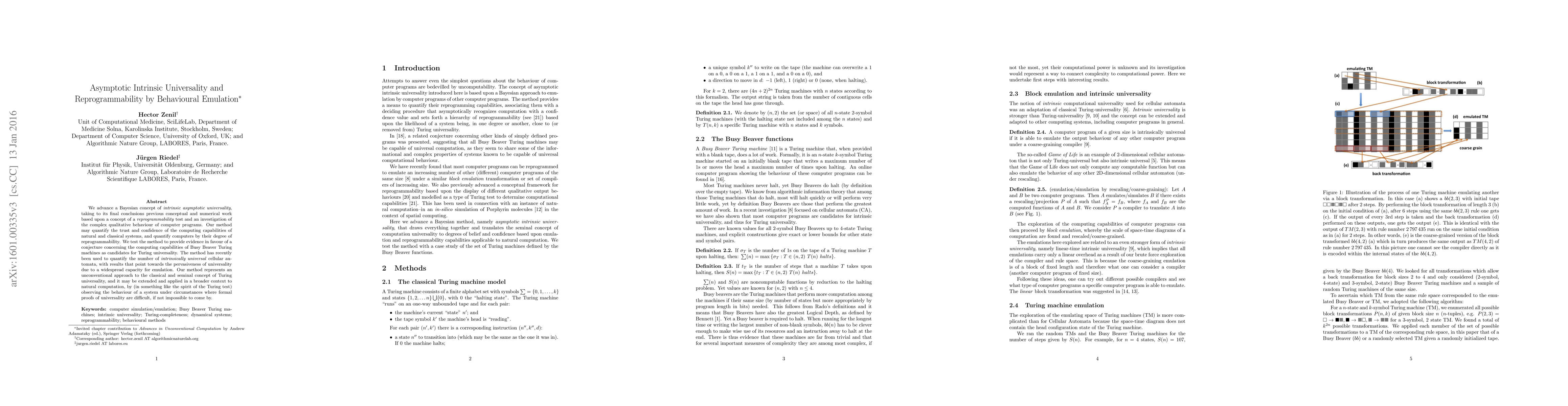 We advance a Bayesian concept of 'intrinsic asymptotic universality' taking to its final conclusions previous conceptual and numerical work based upon a concept of a reprogrammability test and an investigation of the complex qualitative behaviour of computer programs. Our method may quantify the trust and confidence of the computing capabilities of natural and classical systems, and quantify computers by their degree of reprogrammability. We test the method to provide evidence in favour of a conjecture concerning the computing capabilities of Busy Beaver Turing machines as candidates for Turing universality. The method has recently been used to quantify the number of 'intrinsically universal' cellular automata, with results that point towards the pervasiveness of universality due to a widespread capacity for emulation. Our method represents an unconventional approach to the classical and seminal concept of Turing universality, and it may be extended and applied in a broader context to natural computation, by (in something like the spirit of the Turing test) observing the behaviour of a system under circumstances where formal proofs of universality are difficult, if not impossible to come by.
