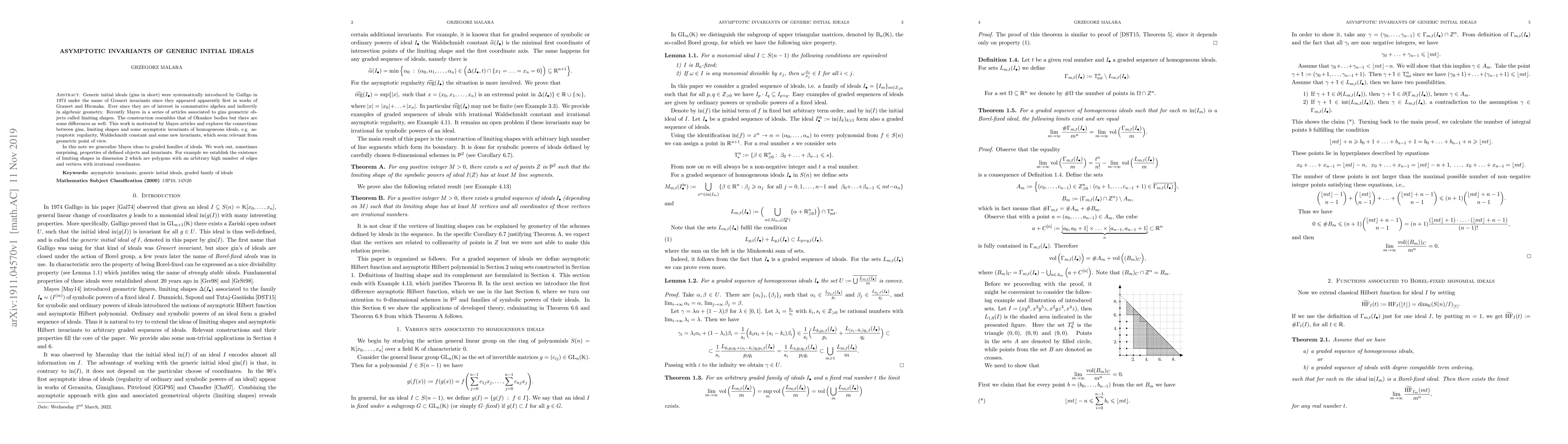 Generic initial ideals (gins in short) were systematically introduced by Galligo in 1974 under the name of Grauert invariants since they appeared apparently first in works of Grauert and Hironaka. Ever since they are of interest in commutative algebra and indirectly in algebraic geometry. Recently Mayes in a series of articles associated to gins geometric objects called limiting shapes. The construction resembles that of Okunkov bodies but there are some differences as well. This work is motivated by Mayes articles and explores the connections between gins, limiting shapes and some asymptotic invariants of homogeneous ideals, e.g. asymptotic regularity, Waldschmidt constant and some new invariants, which seem relevant from geometric point of view. In this note we generalize Mayes ideas to graded families of ideals. We work out, sometimes surprising, properties of defined objects and invariants. For example we establish the existence of limiting shapes in dimension 2 which are polygons with an arbitrary high number of edges and vertices with irrational coordinates.
