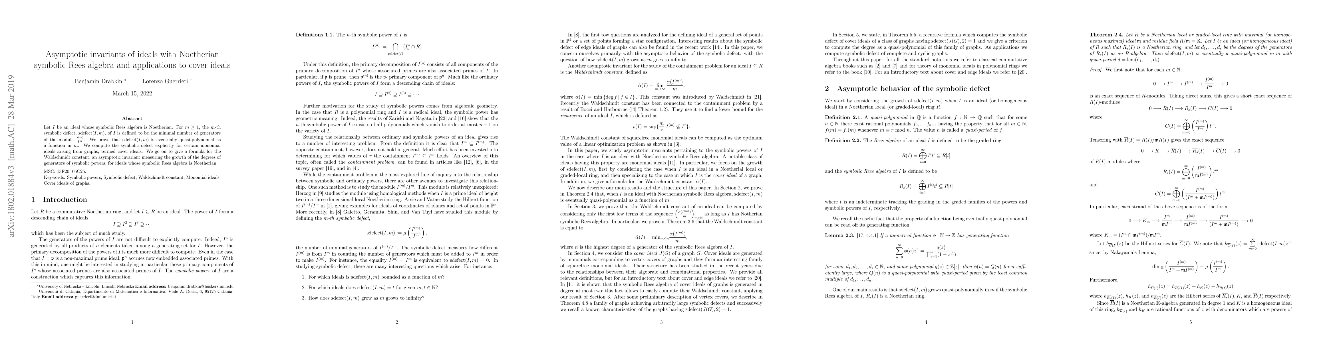 This paper investigates the asymptotic behavior of symbolic defects for Noetherian symbolic Rees algebras, proving that the symbolic defect is eventually quasi-polynomial. It also computes the symbolic defect for cover ideals derived from graphs and provides a formula for the Waldschmidt constant for such ideals.