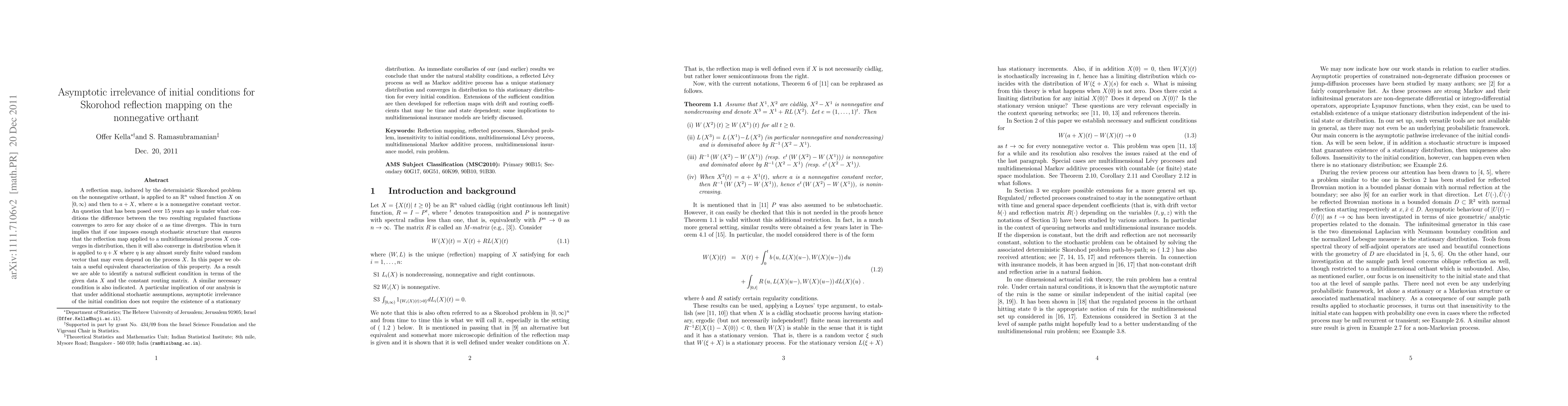 This research paper presents a solution to an open question concerning the asymptotic irrelevance of initial conditions for Skorohod reflection mapping on the nonnegative orthant. The authors provide a novel equivalent characterization of the property, enabling identification of a natural sufficient condition based on the given data and routing matrix. They also suggest a necessary condition. The findings imply that stochastic convergence doesn't necessitate a stationary distribution. The study extends to time- and state-dependent drift and routing coefficients, with applications to multidimensional insurance models discussed.