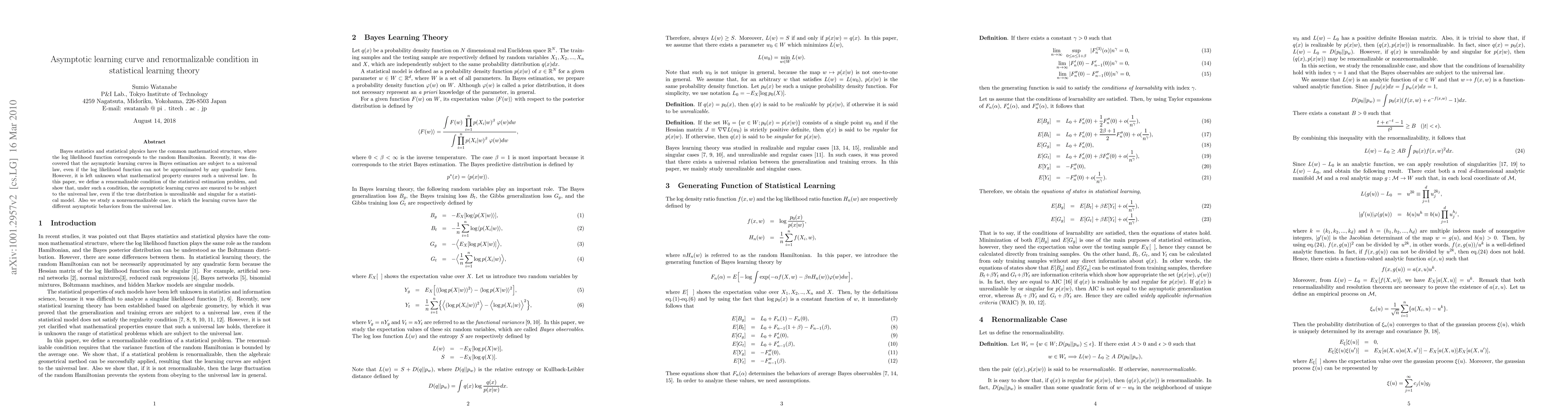 Bayes statistics and statistical physics have the common mathematical structure, where the log likelihood function corresponds to the random Hamiltonian. Recently, it was discovered that the asymptotic learning curves in Bayes estimation are subject to a universal law, even if the log likelihood function can not be approximated by any quadratic form. However, it is left unknown what mathematical property ensures such a universal law. In this paper, we define a renormalizable condition of the statistical estimation problem, and show that, under such a condition, the asymptotic learning curves are ensured to be subject to the universal law, even if the true distribution is unrealizable and singular for a statistical model. Also we study a nonrenormalizable case, in which the learning curves have the different asymptotic behaviors from the universal law.