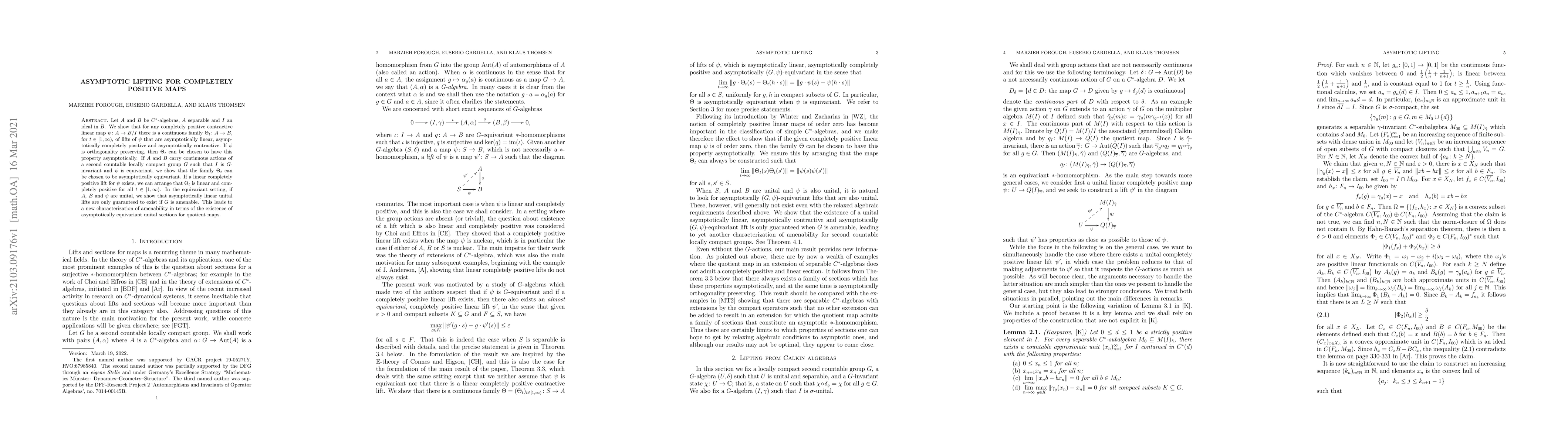 Let $A$ and $B$ be $C^*$-algebras, $A$ separable and $I$ an ideal in $B$. We show that for any completely positive contractive linear map $\psi\colon A\to B/I$ there is a continuous family $\Theta_t\colon A\to B$, for $t\in [1,\infty)$, of lifts of $\psi$ that are asymptotically linear, asymptotically completely positive and asymptotically contractive. If $\psi$ is orthogonality preserving, then $\Theta_t$ can be chosen to have this property asymptotically. If $A$ and $B$ carry continuous actions of a second countable locally compact group $G$ such that $I$ is $G$-invariant and $\psi$ is equivariant, we show that the family $\Theta_t$ can be chosen to be asymptotically equivariant. If a linear completely positive lift for $\psi$ exists, we can arrange that $\Theta_t$ is linear and completely positive for all $t\in [1,\infty)$. In the equivariant setting, if $A$, $B$ and $\psi$ are unital, we show that asymptotically linear unital lifts are only guaranteed to exist if $G$ is amenable. This leads to a new characterization of amenability in terms of the existence of asymptotically equivariant unital sections for quotient maps.