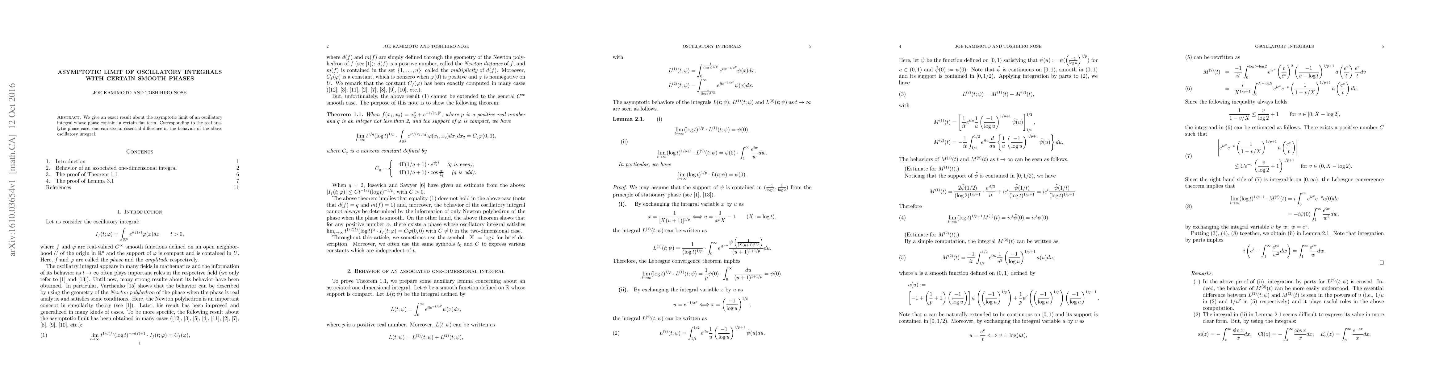 This paper studies the asymptotic limit of oscillatory integrals with certain smooth phases, revealing key differences in behavior between real analytic phase cases.