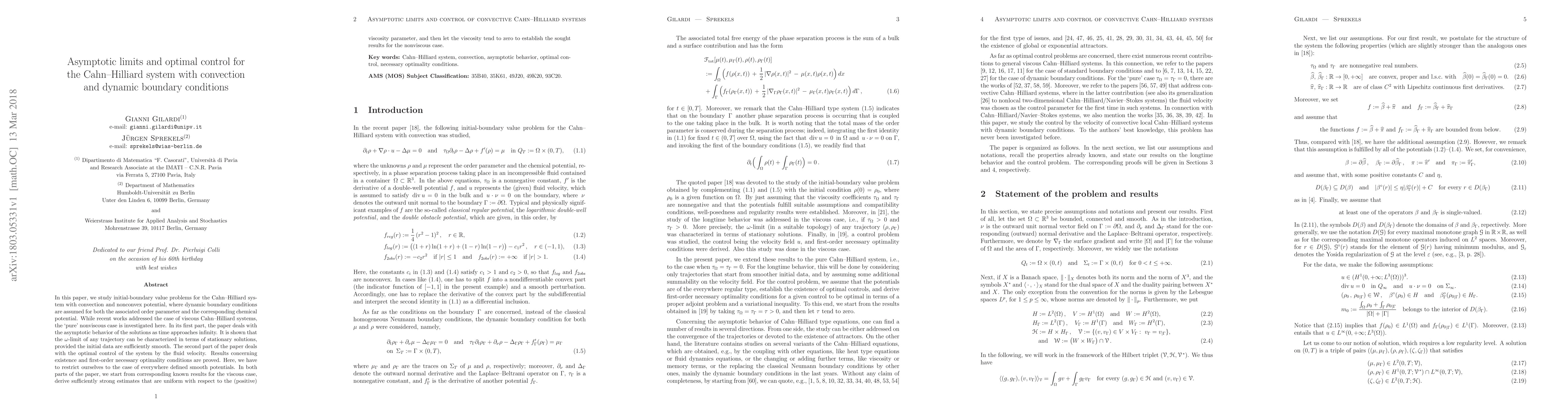 In this paper, we study initial-boundary value problems for the Cahn--Hilliard system with convection and nonconvex potential, where dynamic boundary conditions are assumed for both the associated order parameter and the corresponding chemical potential. While recent works addressed the case of viscous Cahn--Hilliard systems, the `pure' nonviscous case is investigated here. In its first part, the paper deals with the asymptotic behavior of the solutions as time approaches infinity. It is shown that the $\omega$-limit of any trajectory can be characterized in terms of stationary solutions, provided the initial data are sufficiently smooth. The second part of the paper deals with the optimal control of the system by the fluid velocity. Results concerning existence and first-order necessary optimality conditions are proved. Here, we have to restrict ourselves to the case of everywhere defined smooth potentials. In both parts of the paper, we start from corresponding known results for the viscous case, derive sufficiently strong estimates that are uniform with respect to the (positive) viscosity parameter, and then let the viscosity tend to zero to establish the sought results for the nonviscous case.