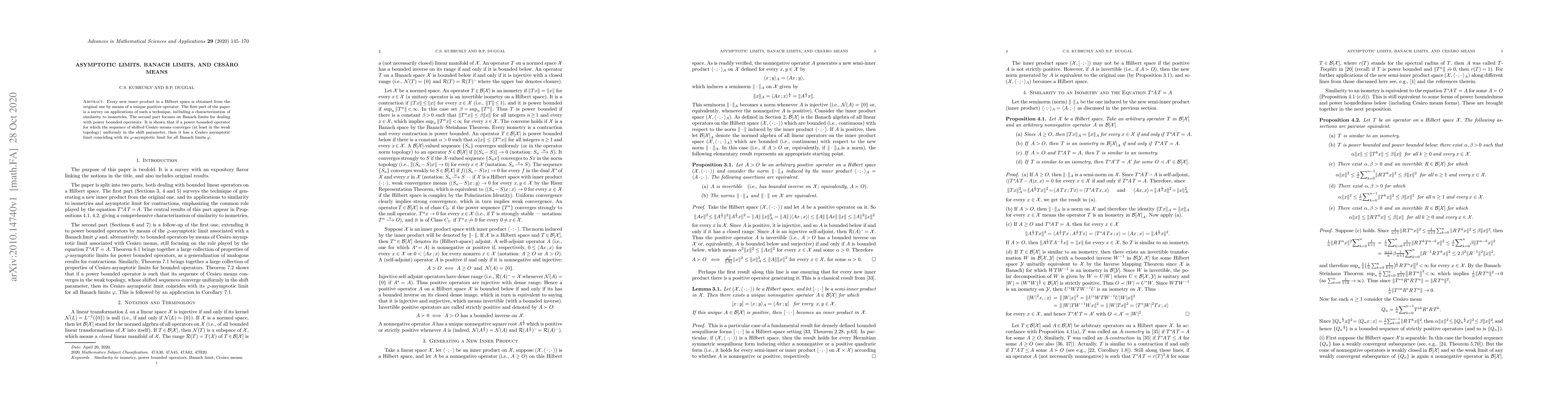 Every new inner product in a Hilbert space is obtained from the original one by means of a unique positive operator$.$ The first part of the paper is a survey on applications of such a technique, including a characterization of similarity to isometries$.$ The second part focuses on Banach limits for dealing with power bounded operators. It is shown that if a power bounded operator for which the sequence of shifted Ces\`aro means converges (at least in the weak topology) uniformly in the shift parameter, then it has a Ces\`aro asymptotic limit coinciding with its $\varphi$-asymptotic limit for all Banach limits $\varphi$.