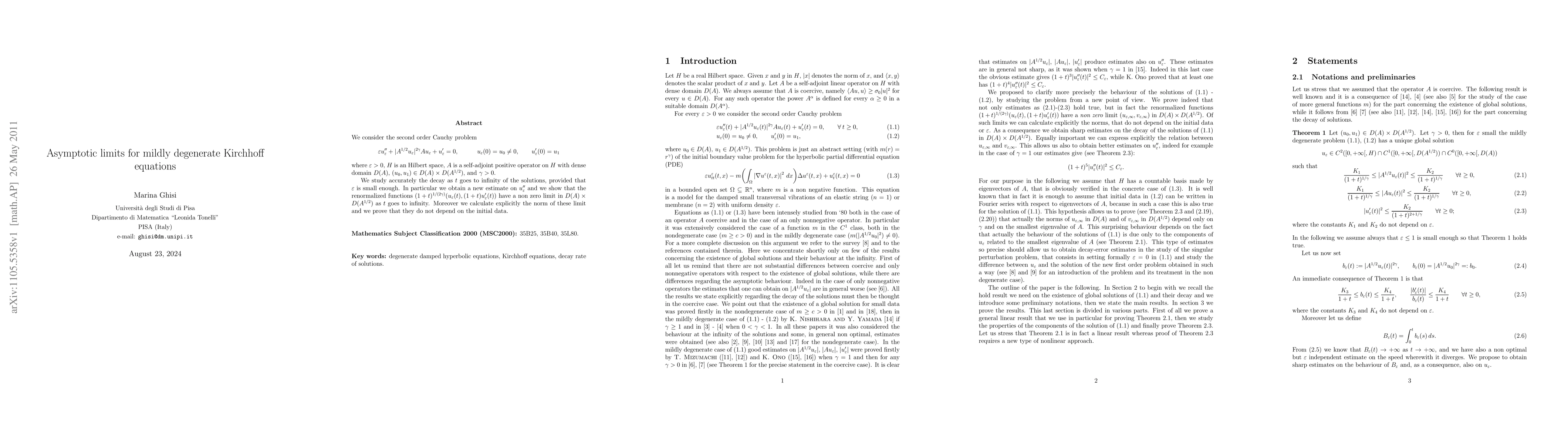We study the asymptotic behavior of the solutions of the mildly degenerate Kirchhoff equation with a dissipative term. We obtain a new estimate on second-in-time derivative of the solution. Moreover we renormalize the solution in such a way that the renormalization as a no zero limit as t goes to infinity. Finally we calculate explicitly the norm of this limit and we prove that it does not depend on the initial data.