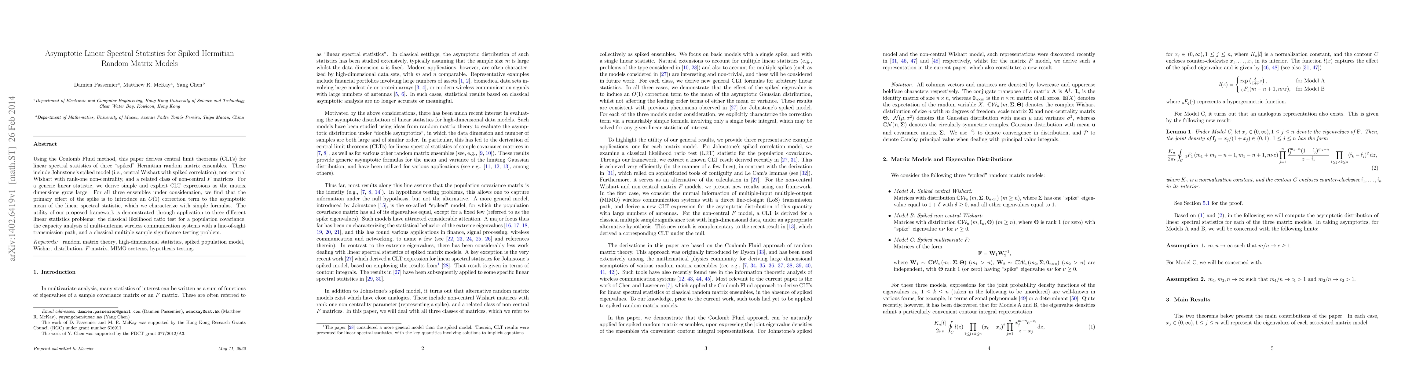 This paper uses the Coulomb Fluid method to derive central limit theorems for linear spectral statistics in three spiked Hermitian random matrix models, showing an $O(1)$ correction due to the spike. Applications include statistical tests, wireless communication capacity analysis, and multiple sample significance testing.