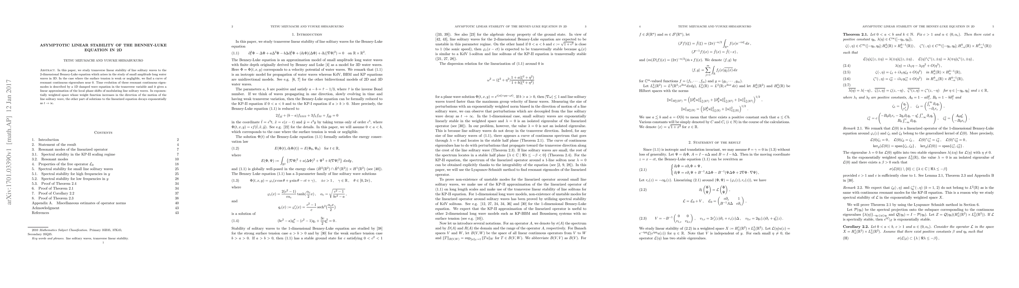 Researchers studied the stability of line solitary waves in a 2D equation that models small amplitude long water waves, finding that weak surface tension leads to resonant continuous eigenvalues with decaying solutions.