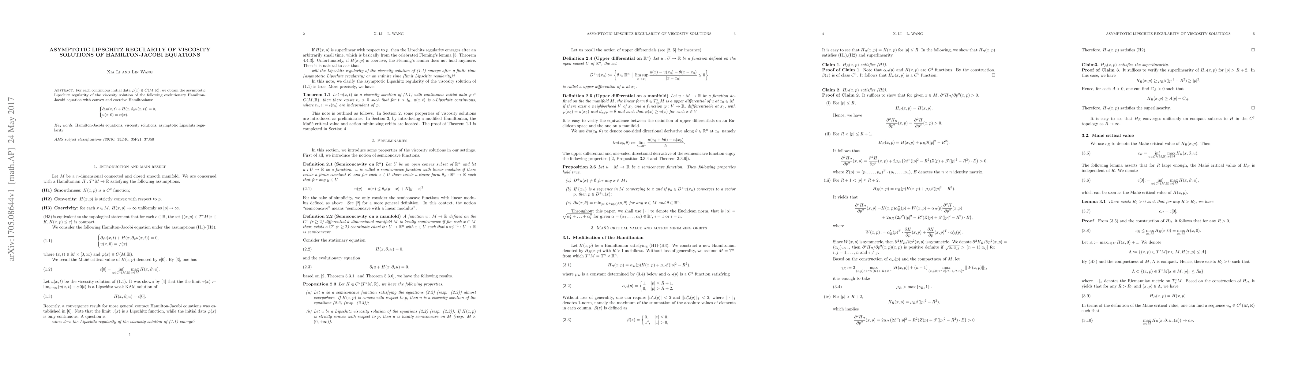 For each continuous initial data $\varphi(x)\in C(M,\mathbb{R})$, we obtain the asymptotic Lipschitz regularity of the viscosity solution of the following evolutionary Hamilton-Jacobi equation with convex and coercive Hamiltonians: \partial_tu(x,t)+H(x,\partial_xu(x,t))=0, u(x,0)=\varphi(x).