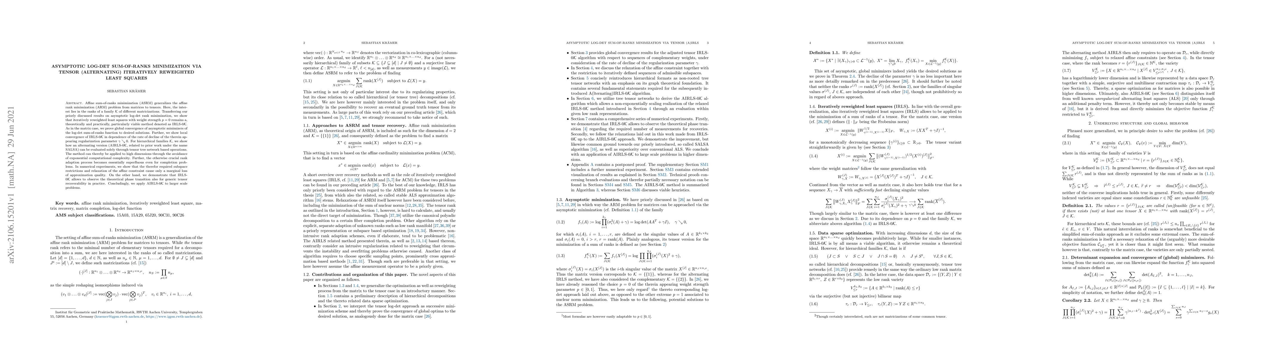 Affine sum-of-ranks minimization (ASRM) generalizes the affine rank minimization (ARM) problem from matrices to tensors. Here, the interest lies in the ranks of a family $\mathcal{K}$ of different matricizations. Transferring our priorly discussed results on asymptotic log-det rank minimization, we show that iteratively reweighted least squares with weight strength $p = 0$ remains a, theoretically and practically, particularly viable method denoted as $\mathrm{IRLS}$-$0\mathcal{K}$. As in the matrix case, we prove global convergence of asymptotic minimizers of the log-det sum-of-ranks function to desired solutions. Further, we show local convergence of $\mathrm{IRLS}$-$0\mathcal{K}$ in dependence of the rate of decline of the therein appearing regularization parameter $\gamma \searrow 0$. For hierarchical families $\mathcal{K}$, we show how an alternating version ($\mathrm{AIRLS}$-$0\mathcal{K}$, related to prior work under the name $\mathrm{SALSA}$) can be evaluated solely through tensor tree network based operations. The method can thereby be applied to high dimensions through the avoidance of exponential computational complexity. Further, the otherwise crucial rank adaption process becomes essentially superfluous even for completion problems. In numerical experiments, we show that the therefor required subspace restrictions and relaxation of the affine constraint cause only a marginal loss of approximation quality. On the other hand, we demonstrate that $\mathrm{IRLS}$-$0\mathcal{K}$ allows to observe the theoretical phase transition also for generic tensor recoverability in practice. Concludingly, we apply $\mathrm{AIRLS}$-$0\mathcal{K}$ to larger scale problems.