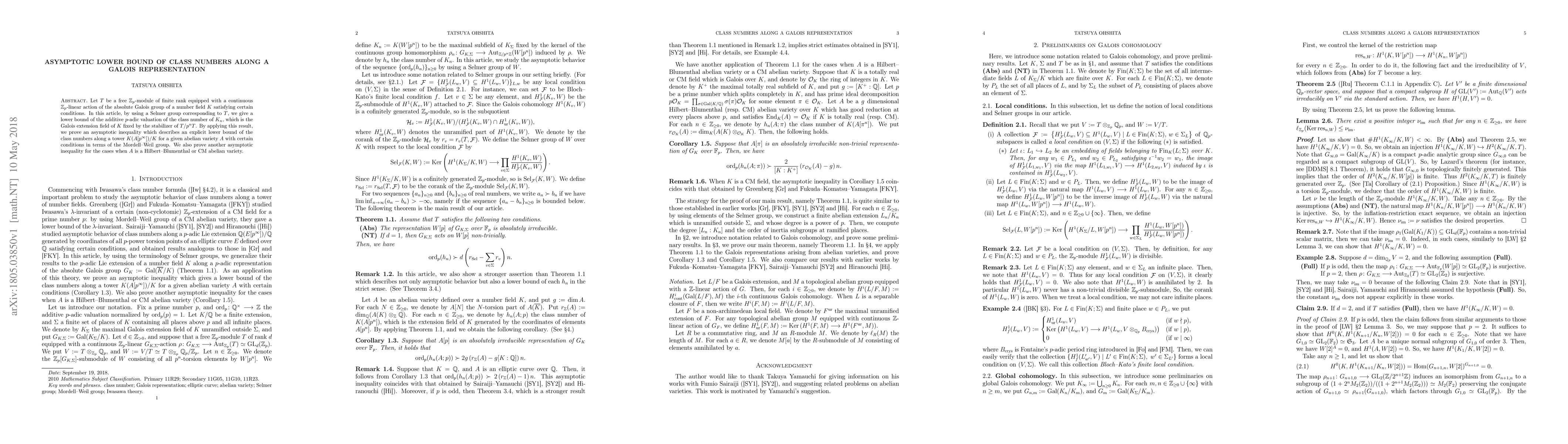 Let T be a free Z_p-module of finite rank equipped with a continuous Z_p-linear action of the absolute Galois group of a number field K satisfying certain conditions. In this article, by using a Selmer group corresponding to T, we give a lower bound of the additive p-adic valuation of the class number of K_n, which is the Galois extension field of K fixed by the stabilizer of T/p^n T. By applying this result, we prove an asymptotic inequality which describes an explicit lower bound of the class numbers along a tower K(A[p^\infty])/K for a given abelian variety A with certain conditions in terms of the Mordell-Weil group. We also prove another asymptotic inequality for the cases when A is a Hilbert--Blumenthal or CM abelian variety.