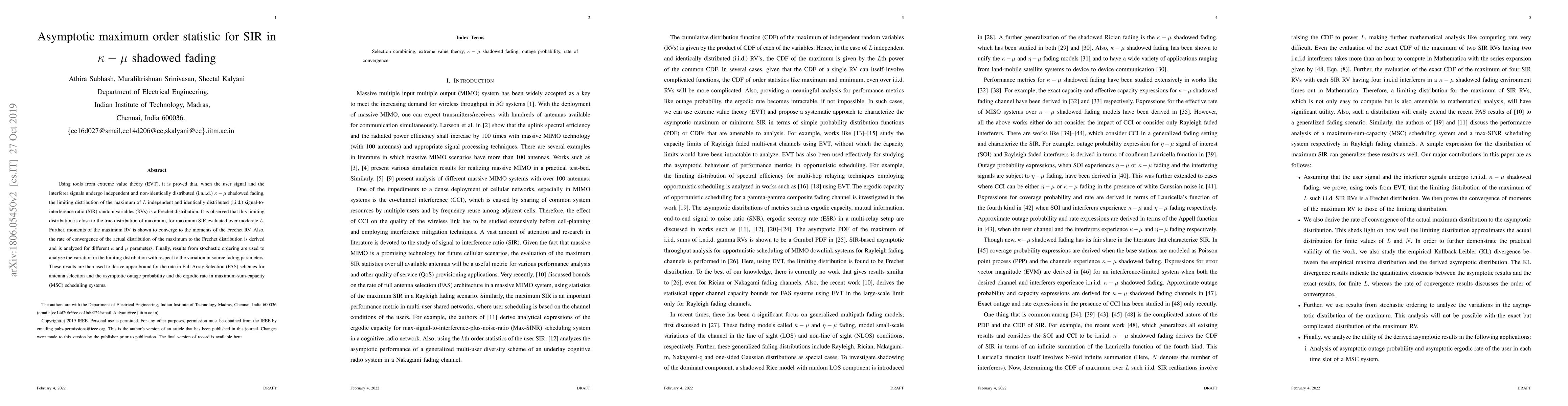 Research finds that in a scenario with fading signals, the maximum signal-to-interference ratio follows a Frechet distribution when signals undergo independent and non-identically distributed θ-μ shadowed fading. The distribution is shown to converge to this form for large number of signals.