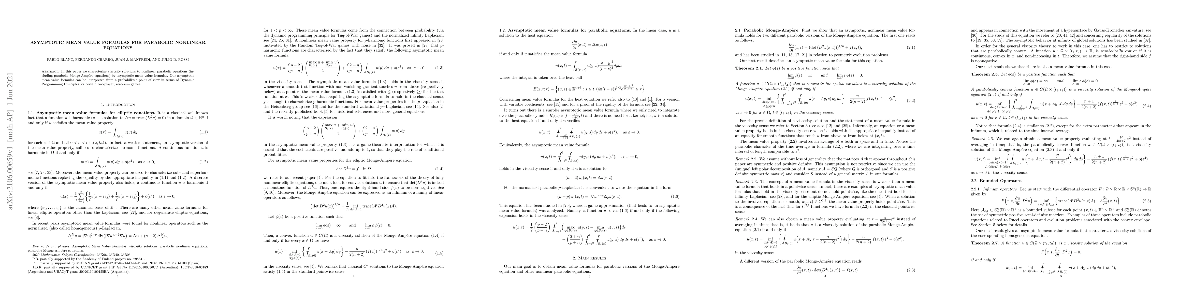 This paper characterizes viscosity solutions to nonlinear parabolic equations, including parabolic Monge-Ampère equations, using asymptotic mean value formulas. These formulas are linked to Dynamic Programming Principles in the context of two-player, zero-sum games.
