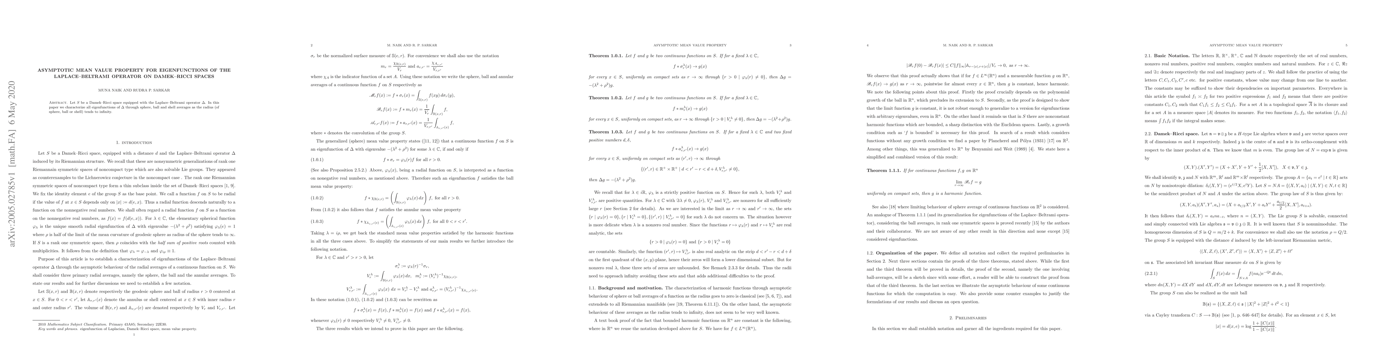 Let $S$ be a Damek-Ricci space equipped with the Laplace-Beltrami operator $\Delta$. In this paper we characterize all eigenfunctions of $\Delta $ through sphere, ball and shell averages as the radius (of sphere, ball or shell) tends to infinity.