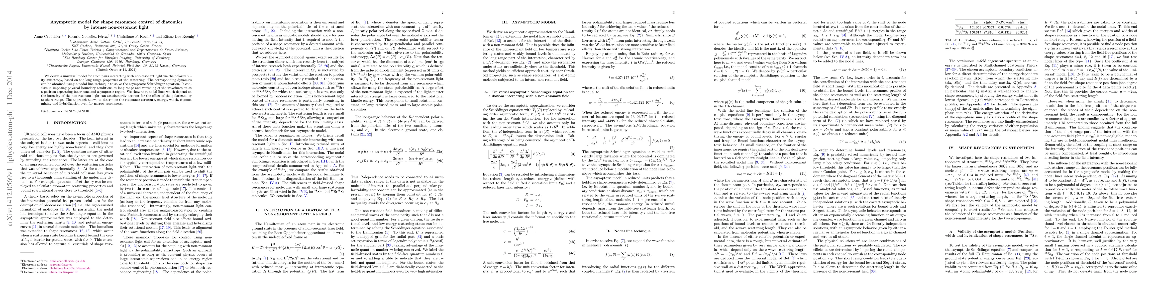 This paper develops a universal asymptotic model for controlling shape resonances in diatomic molecules using intense non-resonant light, based on polarizability anisotropy and long-range scattering properties. The model employs a nodal line technique to solve the asymptotic Schrödinger equation, enabling the determination of resonance characteristics such as energy, width, and channel mixing.