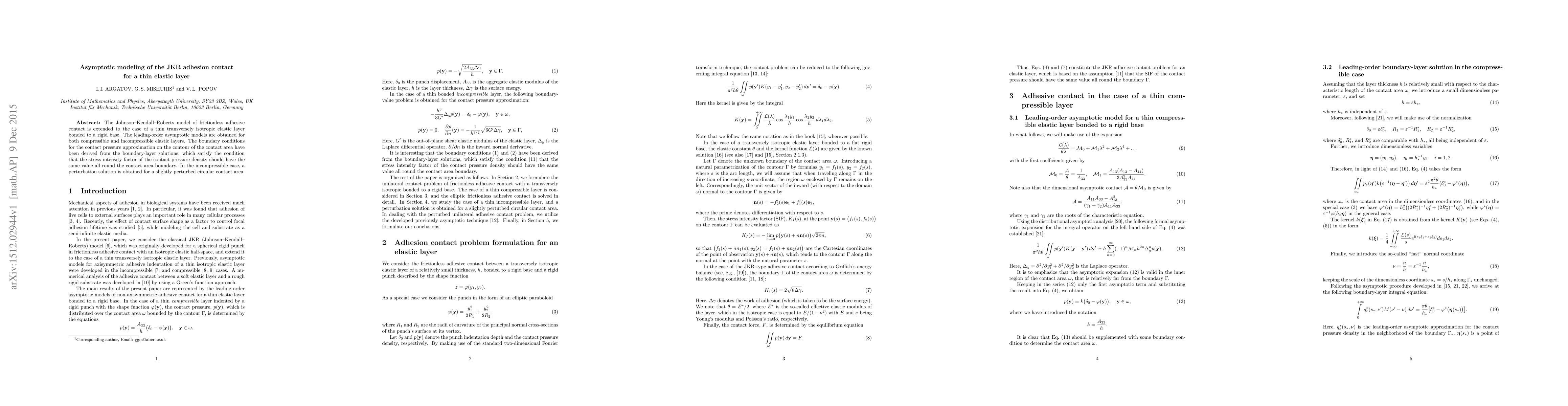 This paper extends the Johnson-Kendall-Roberts model to thin, transversely isotropic elastic layers bonded to rigid bases, deriving leading-order asymptotic models for both compressible and incompressible layers. It also provides boundary conditions for contact pressure approximation based on boundary-layer solutions, ensuring uniform stress intensity factors around the contact area.