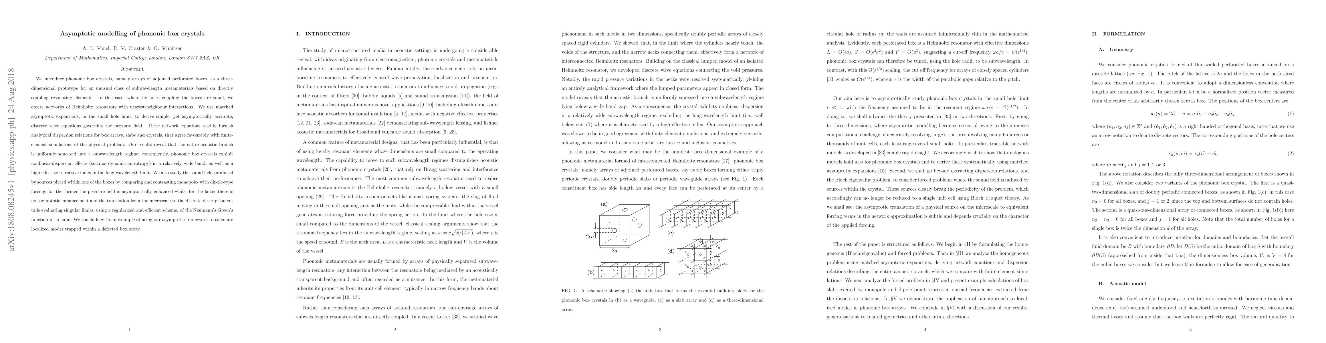 We introduce phononic box crystals, namely arrays of adjoined perforated boxes, as a three-dimensional prototype for an unusual class of subwavelength metamaterials based on directly coupling resonating elements. In this case, when the holes coupling the boxes are small, we create networks of Helmholtz resonators with nearest-neighbour interactions. We use matched asymptotic expansions, in the small hole limit, to derive simple, yet asymptotically accurate, discrete wave equations governing the pressure field. These network equations readily furnish analytical dispersion relations for box arrays, slabs and crystals, that agree favourably with finite-element simulations of the physical problem. Our results reveal that the entire acoustic branch is uniformly squeezed into a subwavelength regime; consequently, phononic box crystals exhibit nonlinear-dispersion effects (such as dynamic anisotropy) in a relatively wide band, as well as a high effective refractive index in the long-wavelength limit. We also study the sound field produced by sources placed within one of the boxes by comparing and contrasting monopole- with dipole-type forcing; for the former the pressure field is asymptotically enhanced whilst for the latter there is no asymptotic enhancement and the translation from the microscale to the discrete description entails evaluating singular limits, using a regularized and efficient scheme, of the Neumann's Green's function for a cube. We conclude with an example of using our asymptotic framework to calculate localized modes trapped within a defected box array.