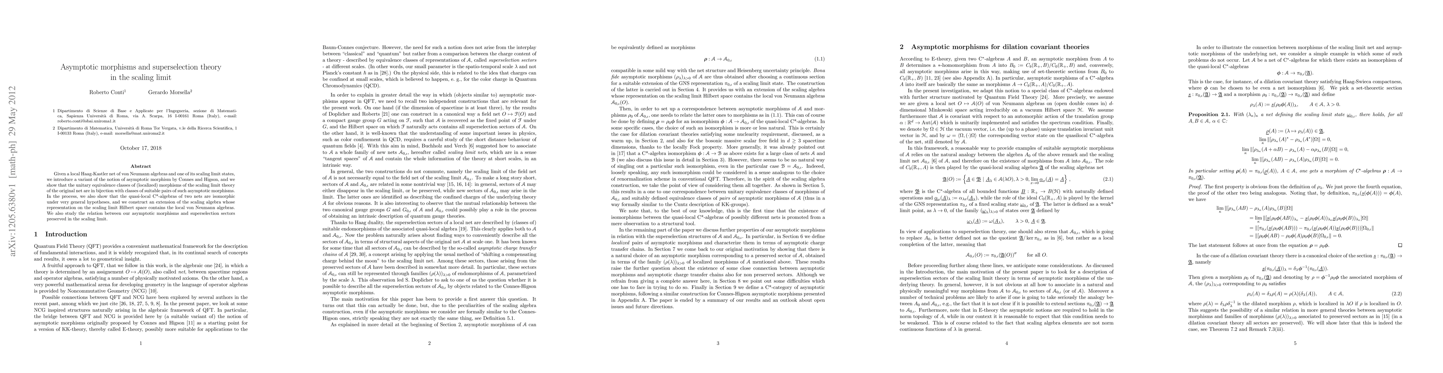 Given a local Haag-Kastler net of von Neumann algebras and one of its scaling limit states, we introduce a variant of the notion of asymptotic morphism by Connes and Higson, and we show that the unitary equivalence classes of (localized) morphisms of the scaling limit theory of the original net are in bijection with classes of suitable pairs of such asymptotic morphisms. In the process, we also show that the quasi-local C*-algebras of two nets are isomorphic under very general hypotheses, and we construct an extension of the scaling algebra whose representation on the scaling limit Hilbert space contains the local von Neumann algebras. We also study the relation between our asymptotic morphisms and superselection sectors preserved in the scaling limit.
