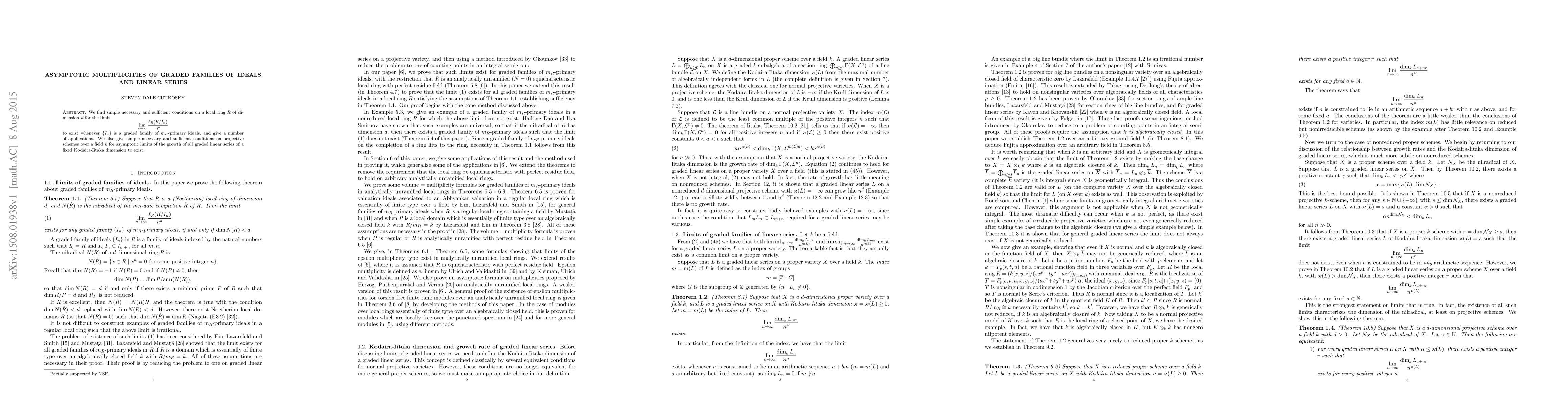 We find simple necessary and sufficient conditions on a local ring $R$ of dimension $d$ for the limit $$ \lim_{i\rightarrow\infty}\frac{\ell_R(R/I_n)}{n^d} $$ to exist whenever $\{I_n\}$ is a graded family of $m_R$-primary ideals, and give a number of applications. We also give simple necessary and sufficient conditions on projective schemes over a field $k$ for asymptotic limits of the growth of all graded linear series of a fixed Kodaira-Iitaka dimension to exist.
