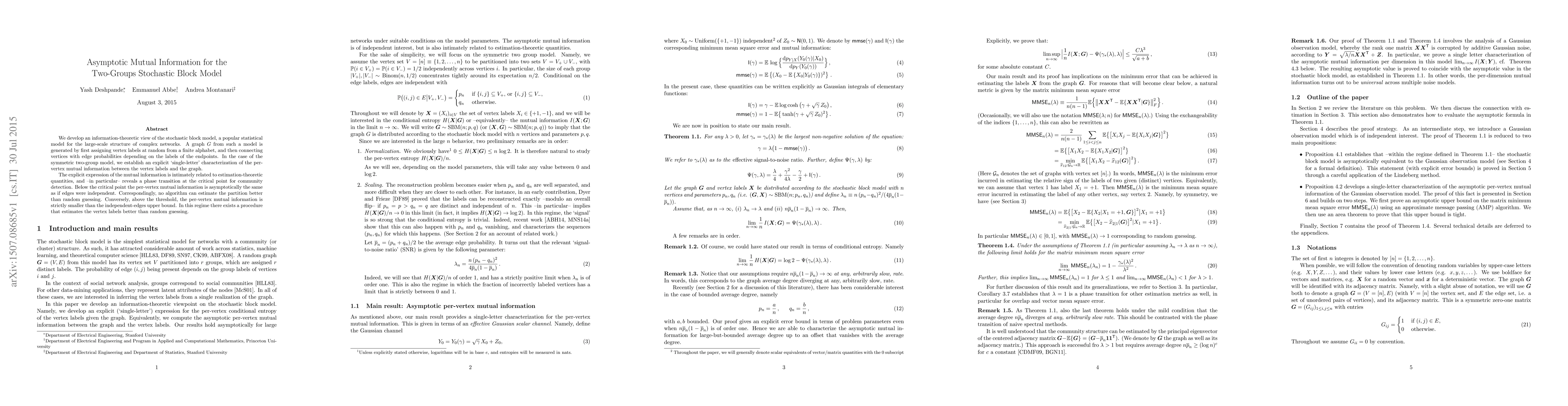 We develop an information-theoretic view of the stochastic block model, a popular statistical model for the large-scale structure of complex networks. A graph $G$ from such a model is generated by first assigning vertex labels at random from a finite alphabet, and then connecting vertices with edge probabilities depending on the labels of the endpoints. In the case of the symmetric two-group model, we establish an explicit `single-letter' characterization of the per-vertex mutual information between the vertex labels and the graph. The explicit expression of the mutual information is intimately related to estimation-theoretic quantities, and --in particular-- reveals a phase transition at the critical point for community detection. Below the critical point the per-vertex mutual information is asymptotically the same as if edges were independent. Correspondingly, no algorithm can estimate the partition better than random guessing. Conversely, above the threshold, the per-vertex mutual information is strictly smaller than the independent-edges upper bound. In this regime there exists a procedure that estimates the vertex labels better than random guessing.