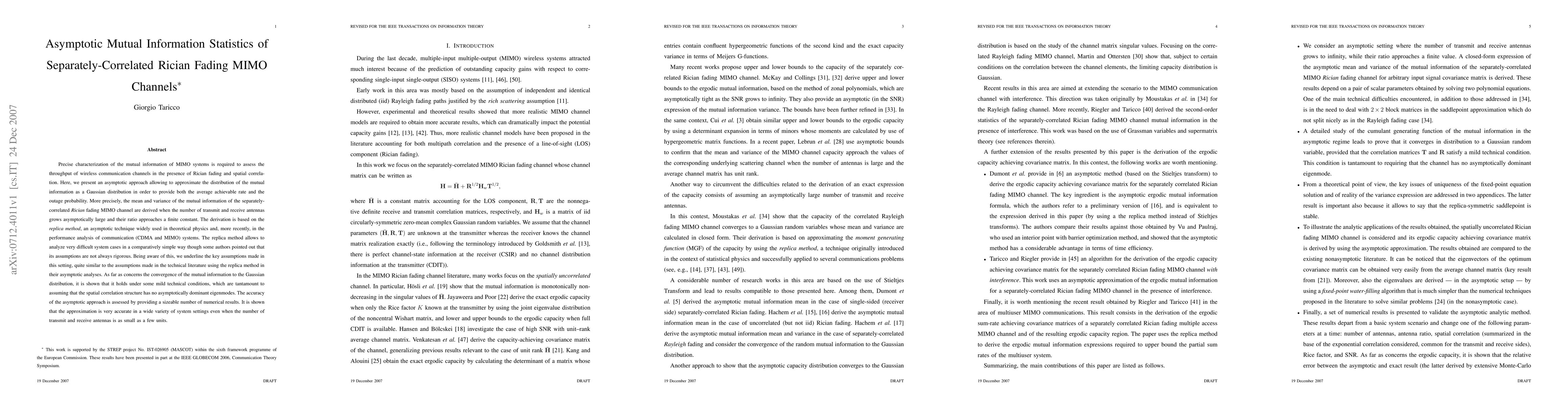 This paper develops an asymptotic approach to approximate the mutual information distribution of separately-correlated Rician fading MIMO channels as Gaussian, providing insights into average achievable rate and outage probability. The replica method is used to derive the mean and variance of mutual information under large antenna conditions, demonstrating high accuracy even for small antenna counts.