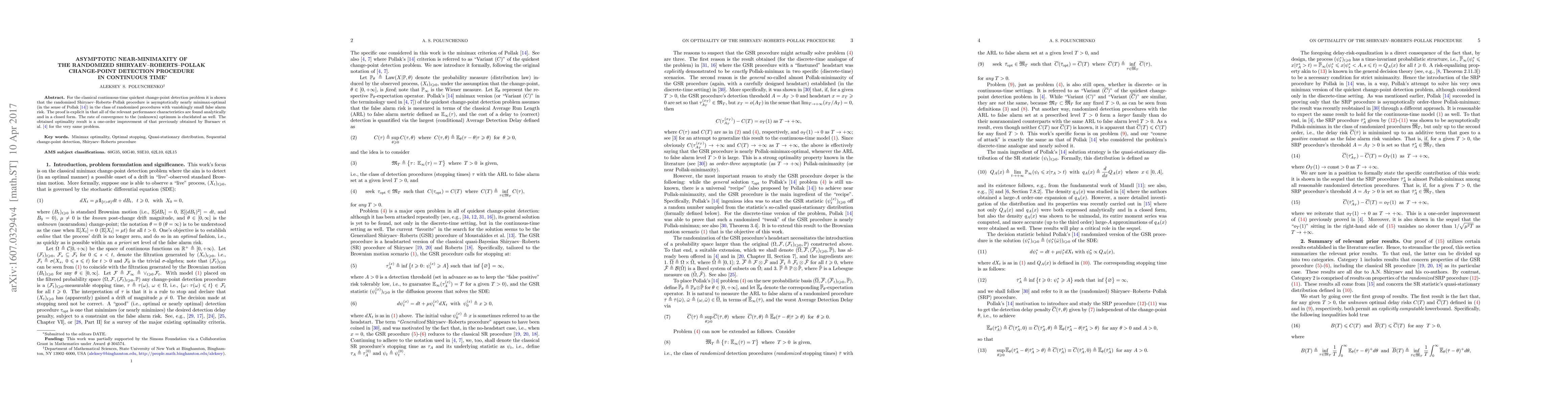 This paper demonstrates that the randomized Shiryaev-Roberts-Pollak procedure is asymptotically nearly minimax-optimal for continuous-time quickest change-point detection, with an explicit analytical proof showing improved convergence rates compared to previous results.