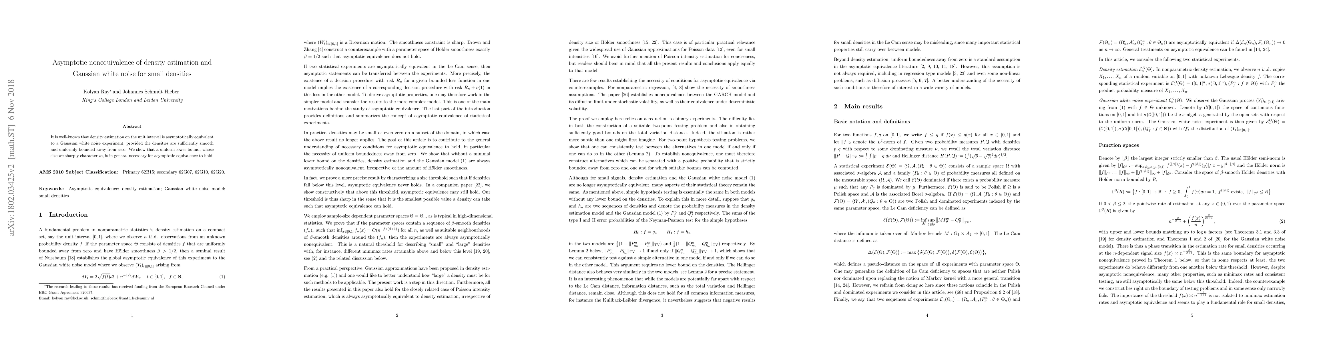 Research shows that a uniform lower bound on density is necessary for asymptotic equivalence between density estimation and Gaussian white noise experiments. This lower bound must be sufficiently large to ensure the densities are uniformly bounded away from zero.