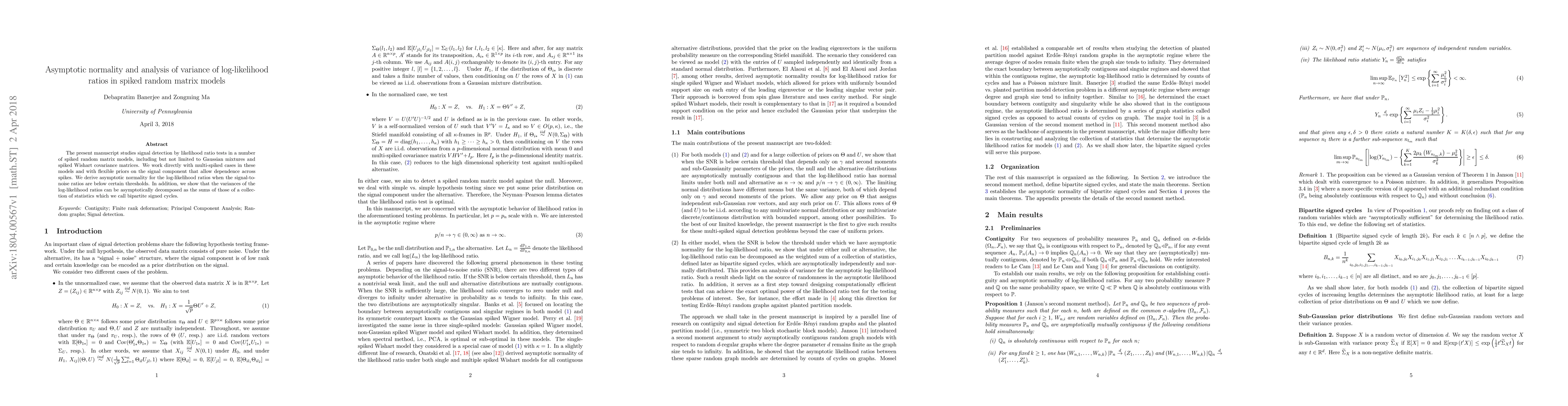 This research paper studies signal detection in spiked random matrix models using likelihood ratio tests, deriving asymptotic normality for log-likelihood ratios and decomposing their variances into bipartite signed cycles.