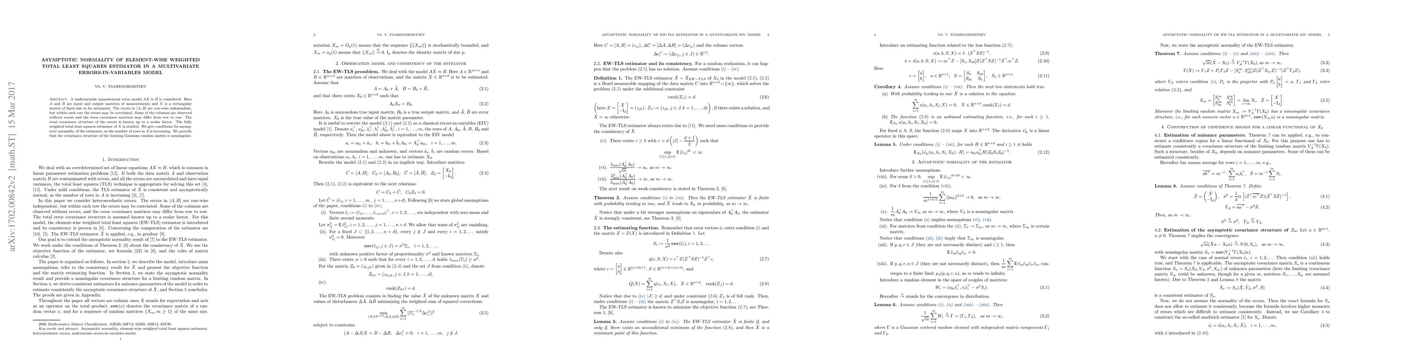This paper investigates the asymptotic normality of the weighted total least squares estimator in a multivariate errors-in-variables model where some columns are error-free. It establishes conditions under which the estimator converges to a nonsingular Gaussian distribution as the number of rows increases.