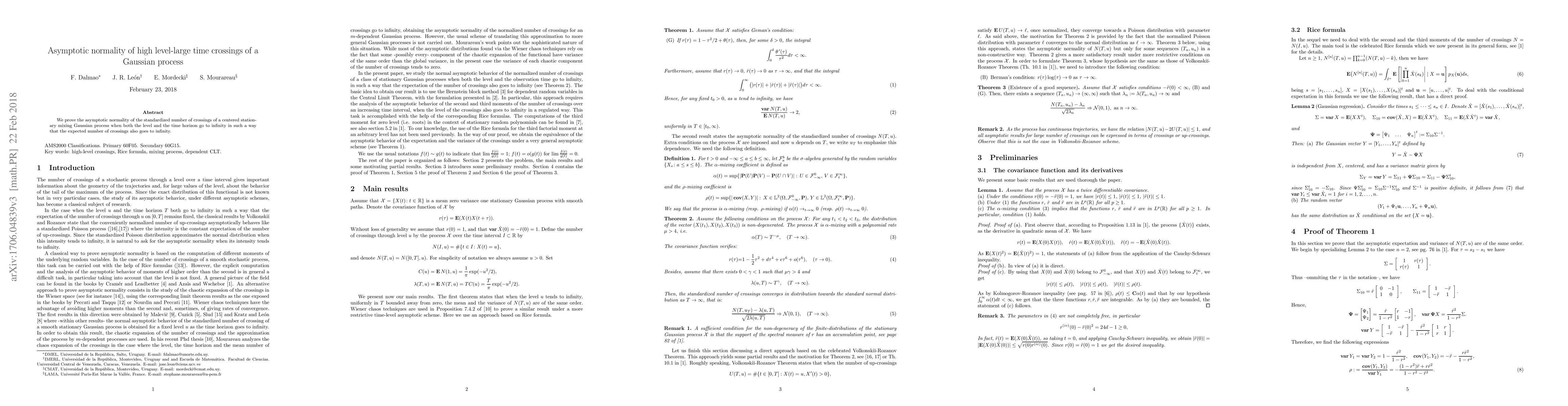 Summary: The paper establishes the asymptotic normality of the standardized count of high-level crossings in a centered stationary mixing Gaussian process as both the crossing level and time horizon increase, ensuring the expected number of crossings also grows. This provides a probabilistic limit theorem for such processes.
