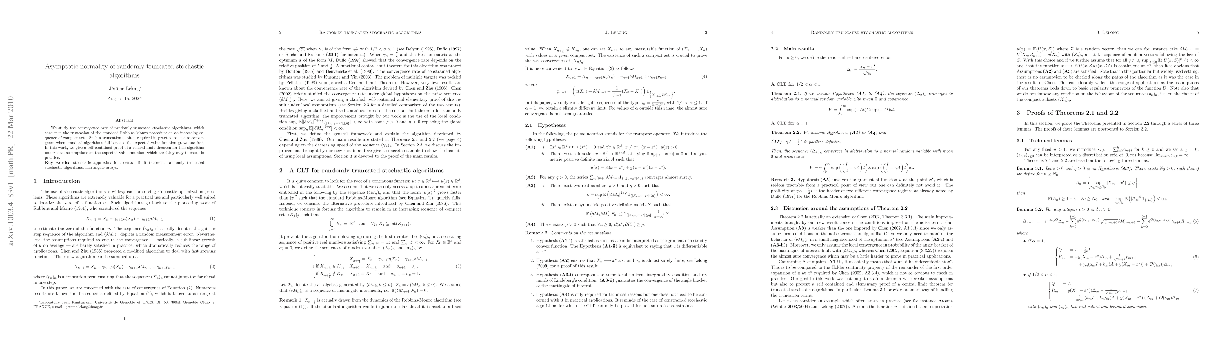 This paper investigates the asymptotic behavior of randomly truncated stochastic algorithms, proving their convergence rate and establishing a central limit theorem under practical local assumptions on the expected-value function. The results provide a theoretical foundation for using such truncated algorithms in scenarios where standard methods fail.