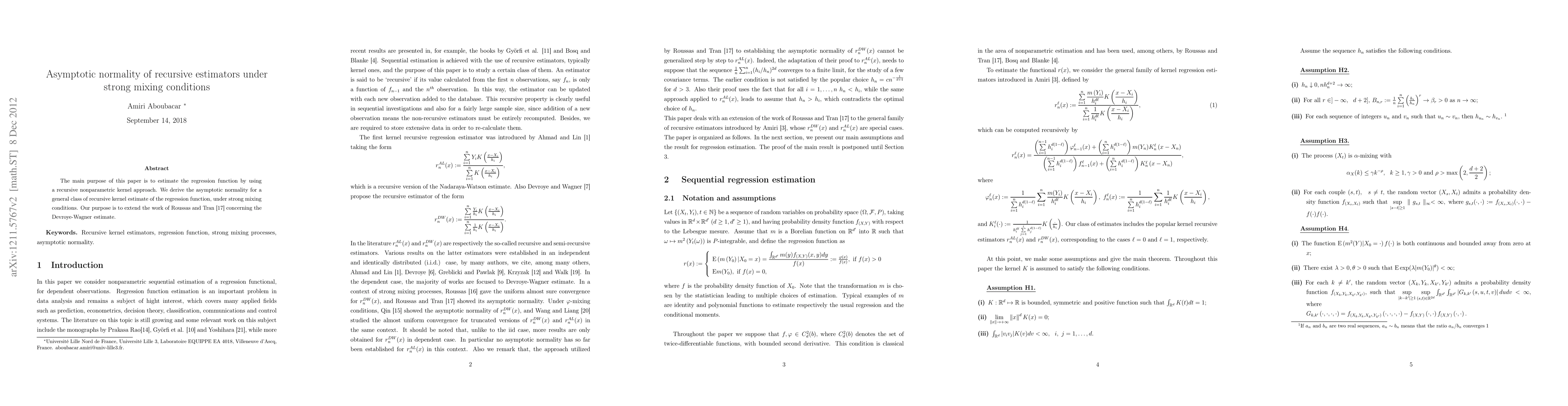This paper demonstrates that recursive estimators of a regression function can achieve asymptotic normality under strong mixing conditions, extending existing work on nonparametric kernel estimation.