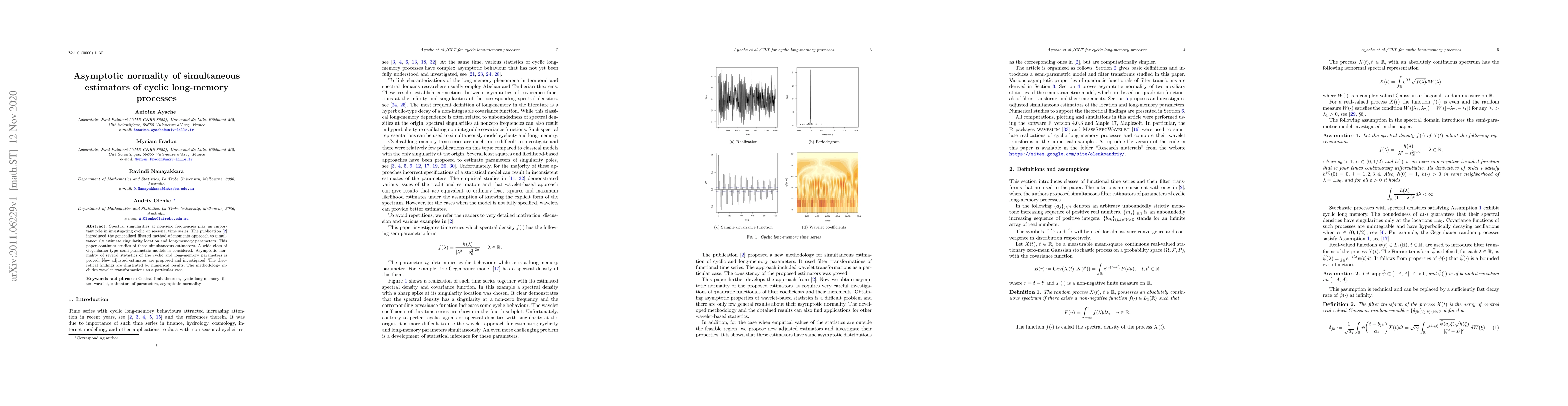This paper investigates the asymptotic normality of simultaneous estimators for cyclic long-memory processes, focusing on spectral singularities and generalized filtered method-of-moments. It proposes new adjusted estimates and demonstrates their theoretical findings through numerical results, including wavelet transformations.