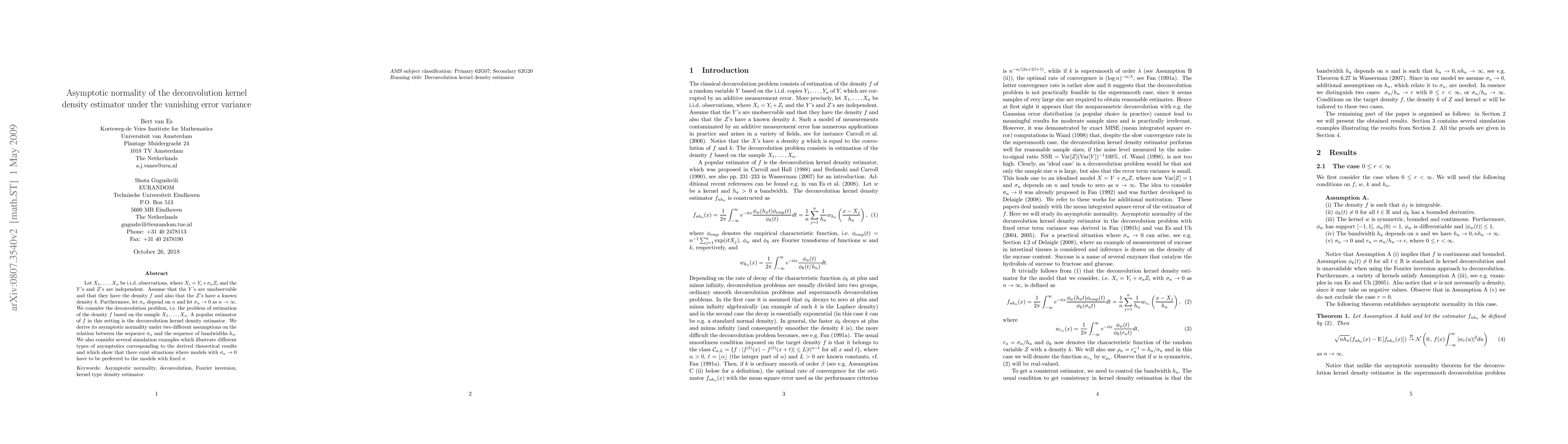 This paper investigates the asymptotic normality of the deconvolution kernel density estimator for estimating an unobservable density $f$ from noisy observations $X_i=Y_i+\sigma_n Z_i$, where $\sigma_n$ decreases to zero. It derives theoretical results under different conditions on the bandwidth $h_n$ and provides simulation examples to illustrate the practical implications of these findings.
