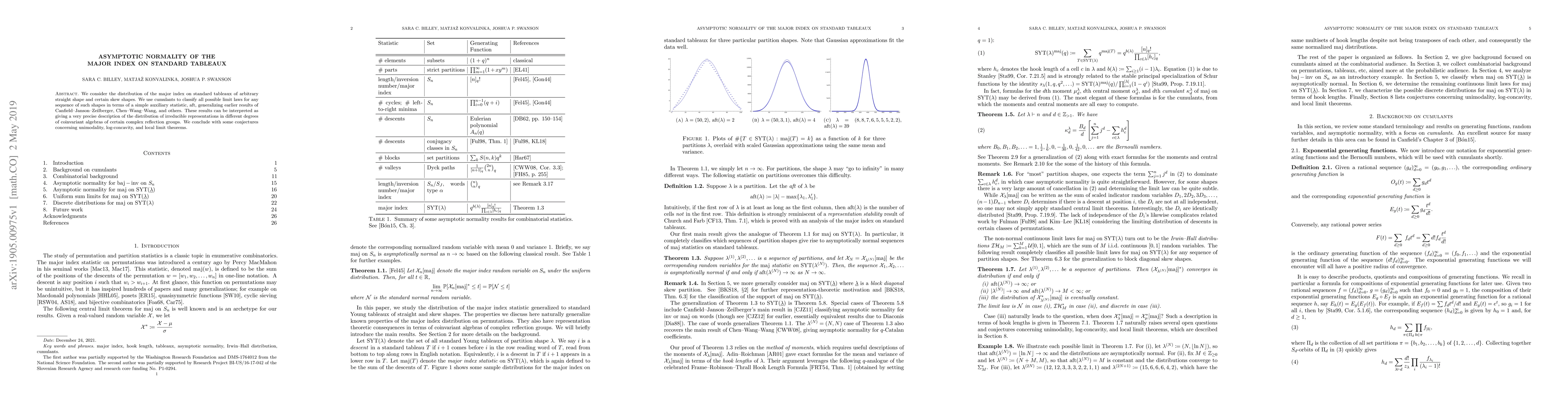 This paper studies the asymptotic normality of the major index on standard tableaux of various shapes, employing cumulants to classify limit laws via an auxiliary statistic aft. The findings provide insights into the distribution of irreducible representations in coinvariant algebras of complex reflection groups and propose conjectures regarding unimodality, log-concavity, and local limit theorems.