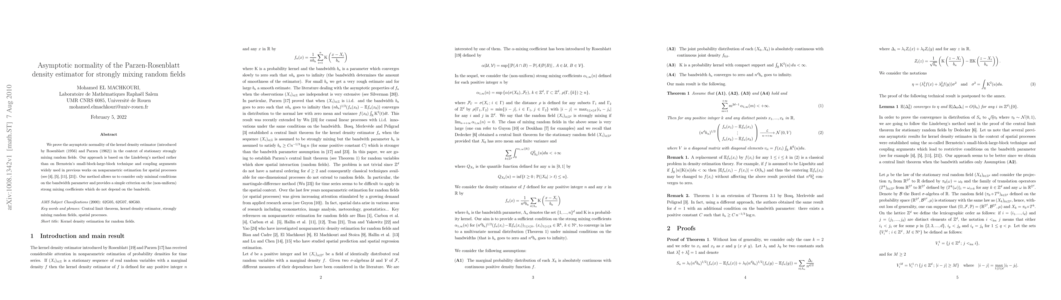 This paper proves the asymptotic normality of the Parzen-Rosenblatt kernel density estimator for stationary strongly mixing random fields using Lindeberg's method, offering a simpler criterion for non-uniform strong mixing coefficients independent of the bandwidth. This approach provides minimal conditions on the bandwidth parameter.