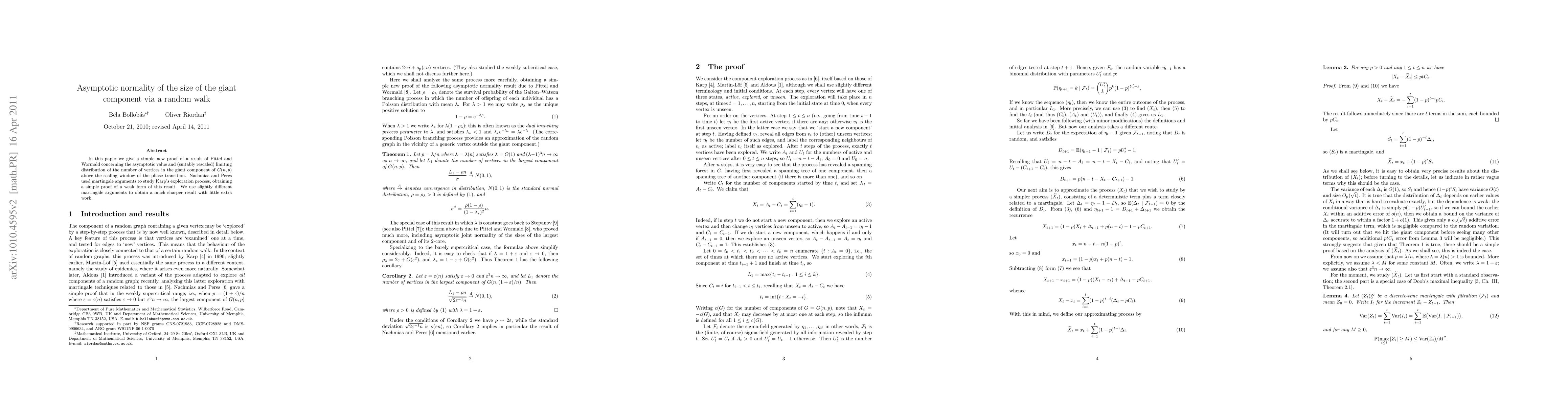 This paper presents a new proof for the asymptotic normality of the size of the giant component in $G(n,p)$, improving upon previous results by Pittel and Wormald and using refined martingale arguments for greater precision.