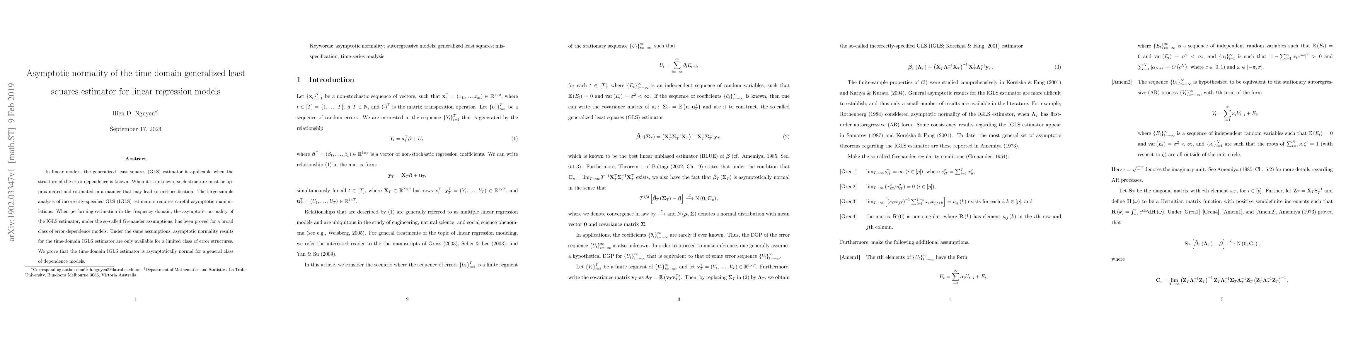 In linear models, the generalized least squares (GLS) estimator is applicable when the structure of the error dependence is known. When it is unknown, such structure must be approximated and estimated in a manner that may lead to misspecification. The large-sample analysis of incorrectly-specified GLS (IGLS) estimators requires careful asymptotic manipulations. When performing estimation in the frequency domain, the asymptotic normality of the IGLS estimator, under the so-called Grenander assumptions, has been proved for a broad class of error dependence models. Under the same assumptions, asymptotic normality results for the time-domain IGLS estimator are only available for a limited class of error structures. We prove that the time-domain IGLS estimator is asymptotically normal for a general class of dependence models.