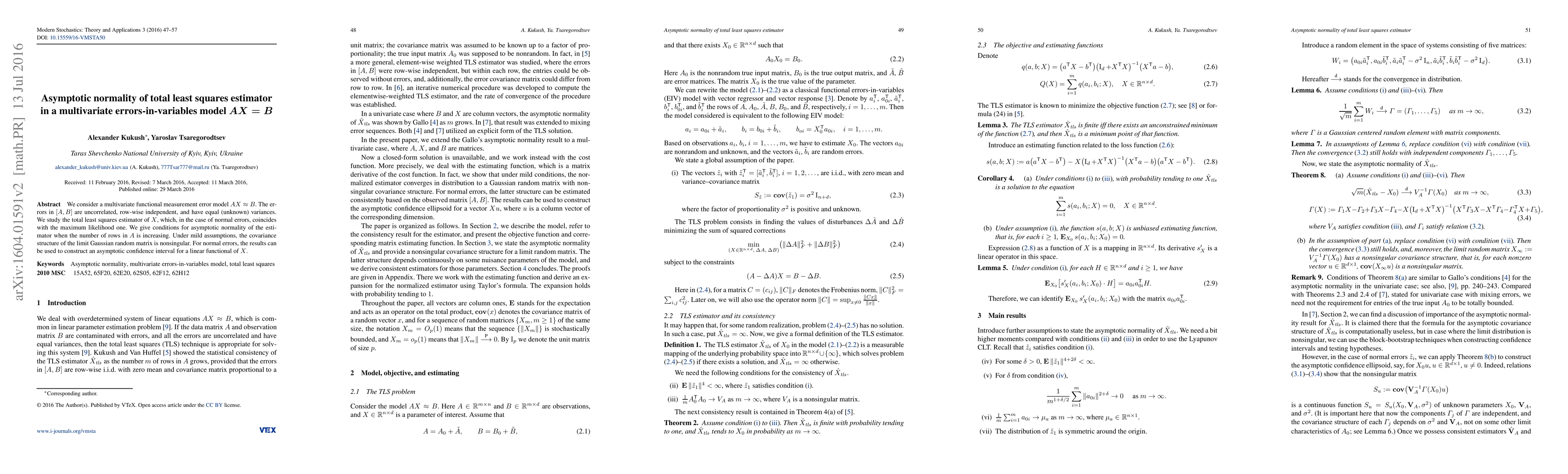 This paper investigates the asymptotic normality of the total least squares estimator in a multivariate errors-in-variables model where $AX \approx B$. It establishes conditions under which the estimator converges to a Gaussian distribution as the number of rows in $A$ increases, providing a framework for constructing asymptotic confidence intervals for linear functionals of $X$.