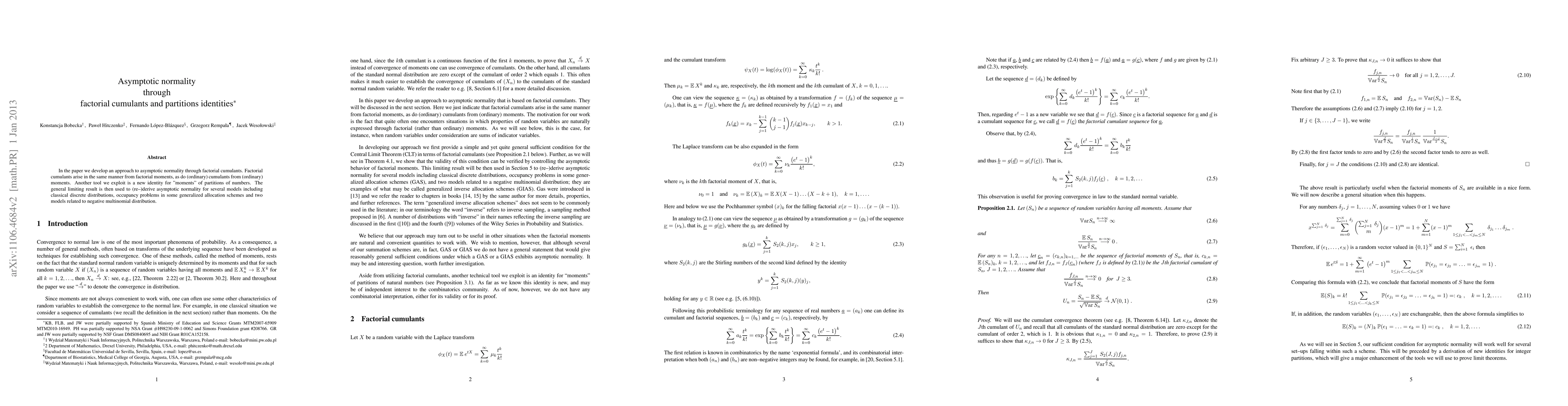 This paper develops an approach to asymptotic normality using factorial cumulants and introduces a new identity for partition moments. It applies the general limiting result to derive asymptotic normality for various models, including classical discrete distributions and occupancy problems.
