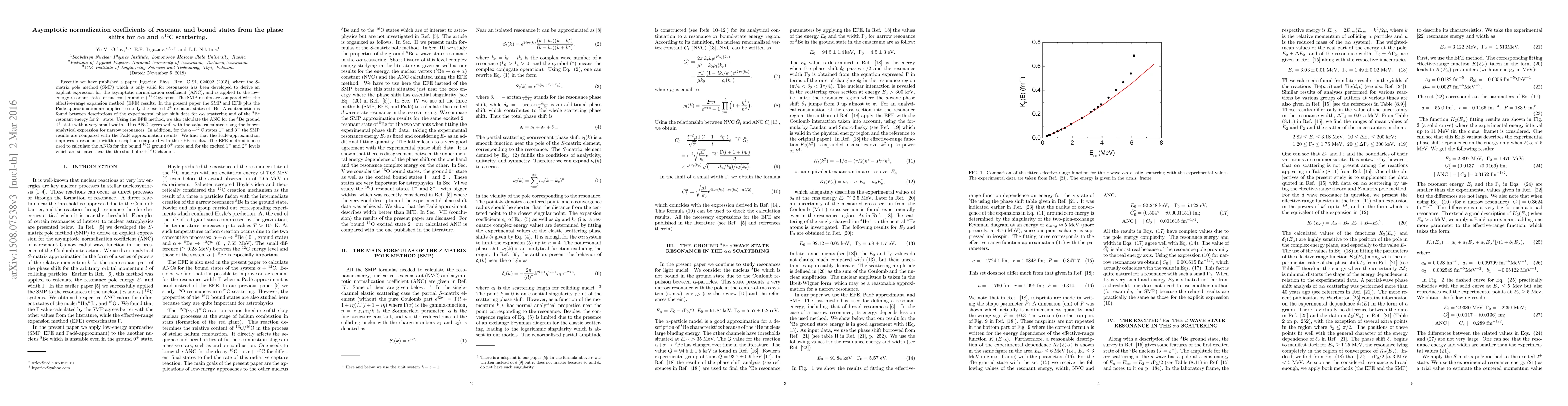 Recently we have published a paper [Irgaziev, Phys. Rev. C 91, 024002 (2015)] where the $S$-matrix pole method (SMP) which is only valid for resonances has been developed to derive a new explicit expression for the asymptotic normalization coefficient (ANC), and is applied to the low-energy resonant states of nucleon$+\alpha$ and $\alpha+^{12}\rm{C}$ systems. The SMP results are compared with the effective-range expansion method (EFE) results. In the present paper the SMP and EFE plus the Pad\'e-approximation are applied to study the excited 2$^+$ resonant states of $^{8}\rm{Be}$. A contradiction is found between descriptions of the experimental phase shift data for $\alpha\alpha$ scattering and of the $^{8}\rm{Be}$ resonant energy for 2$^+$ state. Using the EFE method, we also calculate the ANC for the $^{8}\rm{Be}$ ground 0$^+$ state with a very small width. This ANC agrees well with the value calculated using the known analytical expression for narrow resonances. In addition, for the $\alpha+^{12}\rm{C}$ states1$^-$ and 3$^-$ the SMP results are compared with the Pad\'e-approximation results. We find that the Pad\'e-approximation improves a resonance width description compared with the EFE results. The EFE method is also used to calculate the ANCs for the bound $^{16}\rm{O}$ ground 0$^+$ state and for the excited 1$^-$ and 2$^+$ levels which are situated near the threshold of $\alpha+^{12}\rm{C}$ channel.