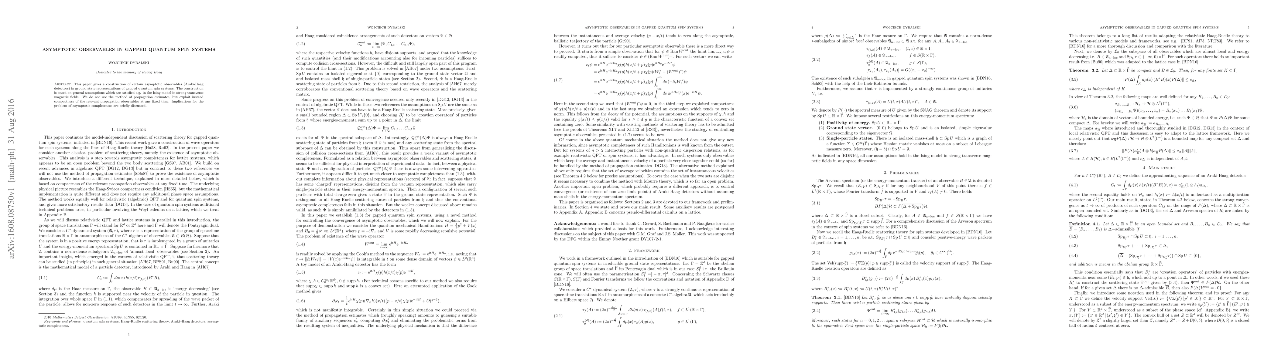 This paper gives a construction of certain asymptotic observables (Araki-Haag detectors) in ground state representations of gapped quantum spin systems. The construction is based on general assumptions which are satisfied e.g. in the Ising model in strong transverse magnetic fields. We do not use the method of propagation estimates, but exploit instead compactness of the relevant propagation observables at any fixed time. Implications for the problem of asymptotic completeness are briefly discussed.