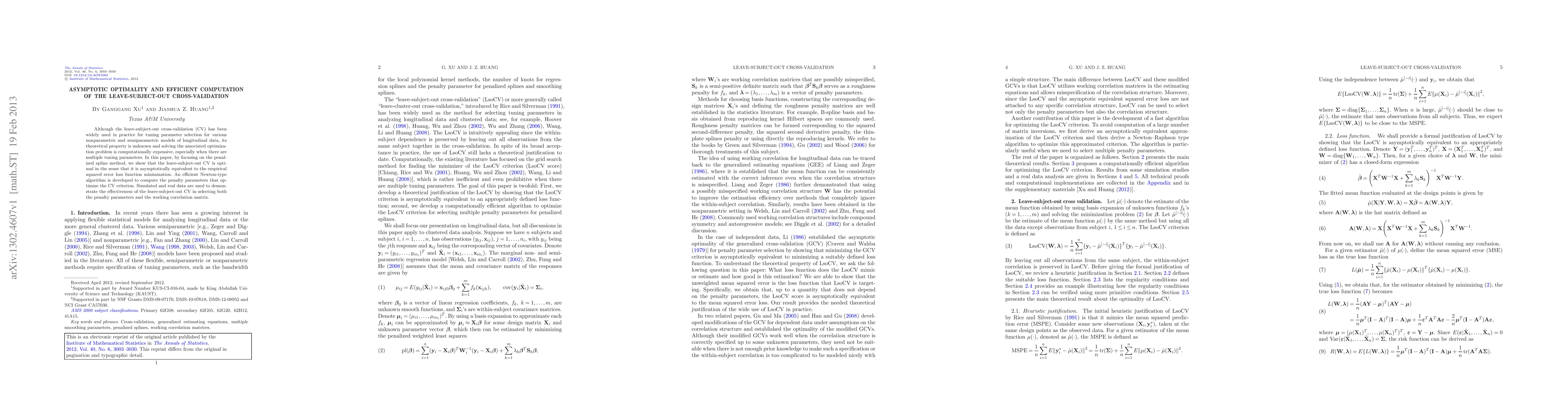 This paper demonstrates that leave-subject-out cross-validation is asymptotically optimal for tuning parameter selection in penalized spline models for longitudinal data. An efficient Newton-type algorithm is developed to compute the optimal parameters, validated through simulated and real data.